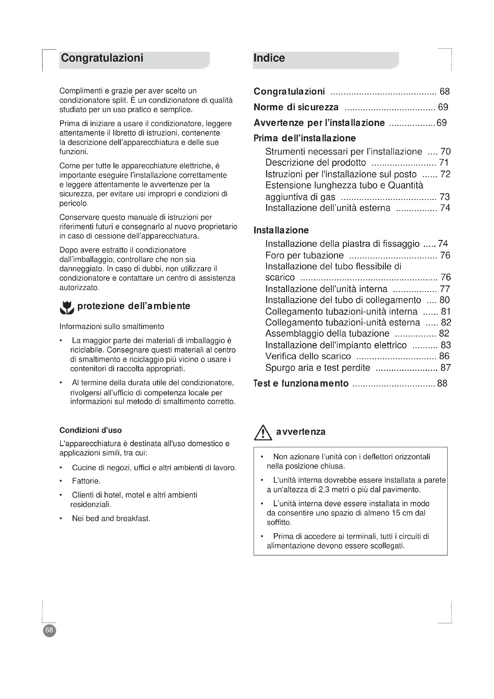 - Test e funzionamento 1RQD]LRQDUHO¶XQLWjFRQLGHÀHWWRULRUL]]RQWDOL nella posizione chiusa. L'unità interna dovrebbe essere installata a parete a un'altezza di 2,3 metri o più dal pavimento. L’unità interna deve essere installata in modo da consentire uno spazio di almeno 15 cm dal VRI¿WWR Prima di accedere ai terminali, tutti i circuiti di alimentazione devono essere scollegati. Congratulazioni Complimenti e grazie per aver scelto un condizionatore split. È un condizionatore di qualità studiato per un uso pratico e semplice. Prima di iniziare a usare il condizionatore, leggere attentamente il libretto di istruzioni, contenente la descrizione dell’apparecchiatura e delle sue funzioni. Come per tutte le apparecchiature elettriche, è importante eseguire l’installazione correttamente e leggere attentamente le avvertenze per la sicurezza, per evitare usi impropri e condizioni di pericolo. Conservare questo manuale di istruzioni per riferimenti futuri e consegnarlo al nuovo proprietario in caso di cessione dell’apparecchiatura. Dopo avere estratto il condizionatore dall’imballaggio, controllare che non sia danneggiato. In caso di dubbi, non utilizzare il condizionatore e contattare un centro di assistenza autorizzato. Informazioni sullo smaltimento La maggior parte dei materiali di imballaggio è riciclabile. Consegnare questi materiali al centro di smaltimento e riciclaggio più vicino o usare i contenitori di raccolta appropriati. Al termine della durata utile del condizionatore, p. 88