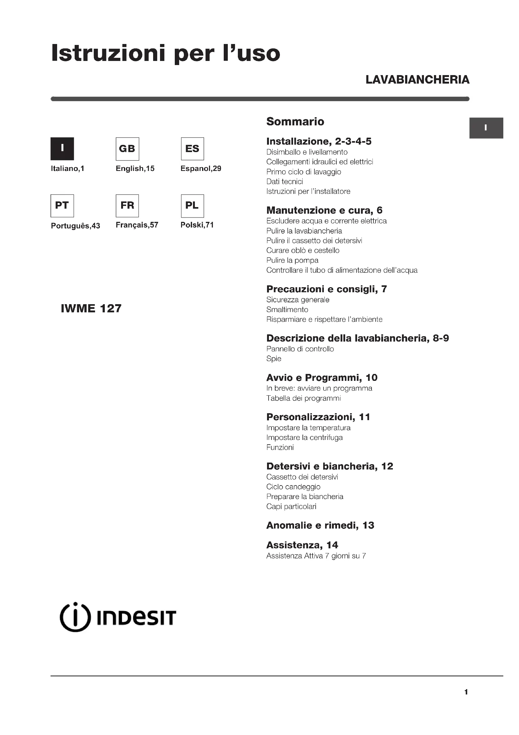 Italiano,1 Sommario Installazione, 2-3-4-5 Disimballo e livellamento Collegamenti idraulici ed elettrici Primo ciclo di lavaggio Dati tecnici Istruzioni per l’installatore Manutenzione e cura, 6 Escludere acqua e corrente elettrica Pulire la lavabiancheria Pulire il cassetto dei detersivi Curare oblò e cestello Pulire la pompa Controllare il tubo di alimentazione dell’acqua Precauzioni e consigli, 7 Sicurezza generale Smaltimento Risparmiare e rispettare l’ambiente Descrizione della lavabiancheria, 8-9 Pannello di controllo Spie Avvio e Programmi, 10 In breve: avviare un programma Tabella dei programmi Personalizzazioni, 11 Impostare la temperatura Impostare la centrifuga Funzioni Detersivi e biancheria, 12 Cassetto dei detersivi Ciclo candeggio Preparare la biancheria Capi particolari Anomalie e rimedi, 13 Assistenza, 14 Assistenza Attiva 7 giorni su 7