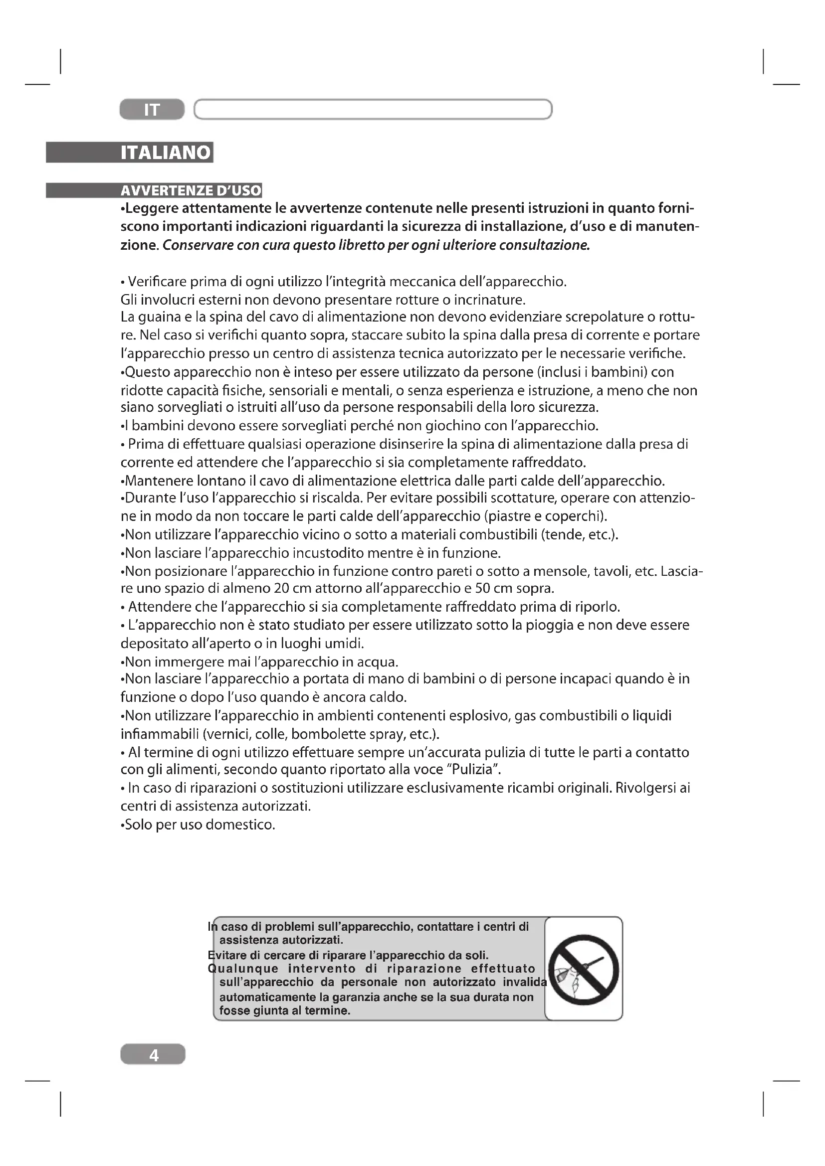 - Solo per uso domestico. In caso di problemi sull’apparecchio, contattare i centri di assistenza autorizzati. Evitare di cercare di riparare l’apparecchio da soli. Qualunque intervento di riparazione effettuato sull’apparecchio da personale non autorizzato invalida automaticamente la garanzia anche se la sua durata non fosse giunta al termine.