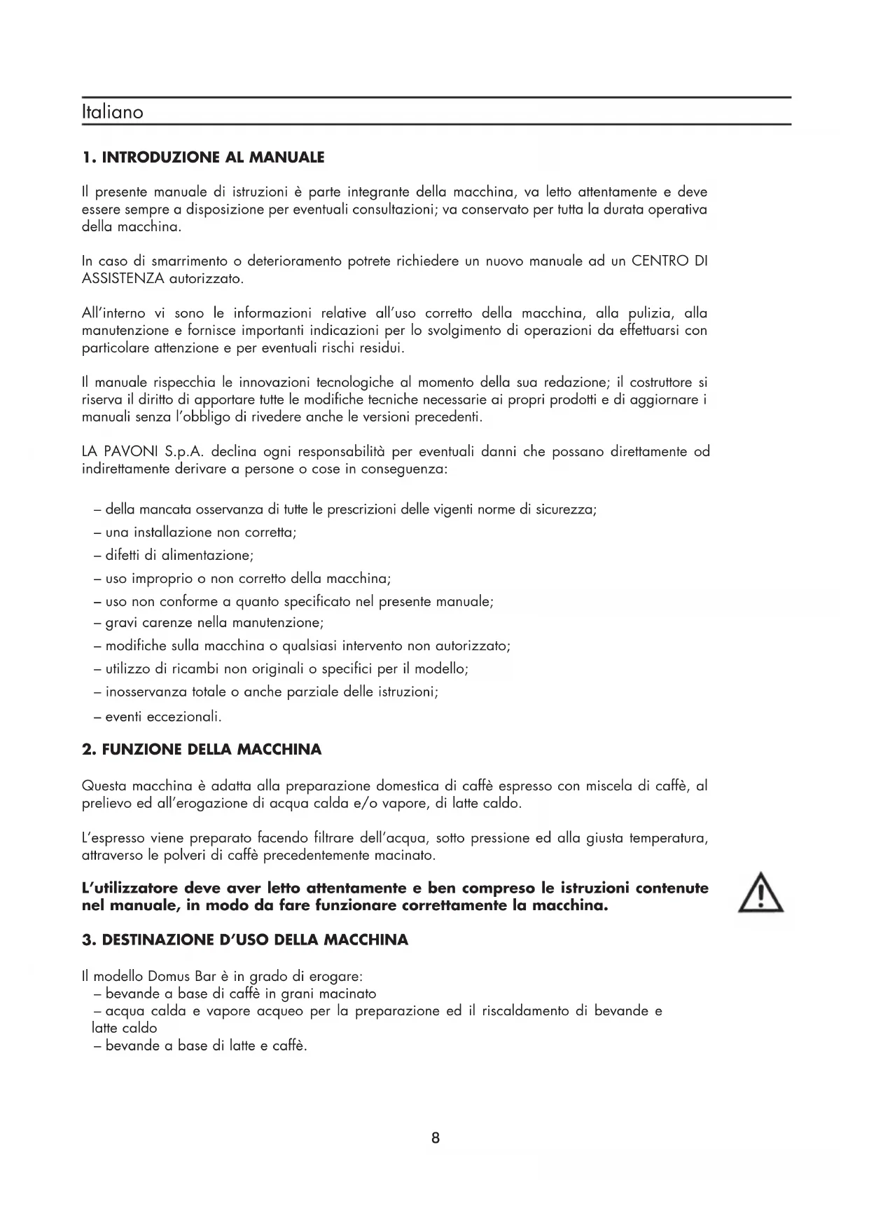 Questa macchina è adatta alla preparazione domestica di caffè espresso con miscela di caffè, al prelievo ed all’erogazione di acqua calda e/o vapore, di latte caldo. L’espresso viene preparato facendo filtrare dell’acqua, sotto pressione ed alla giusta temperatura, attraverso le polveri di caffè precedentemente macinato. L’utilizzatore deve aver letto attentamente e ben compreso le istruzioni contenute nel manuale, in modo da fare funzionare correttamente la macchina.