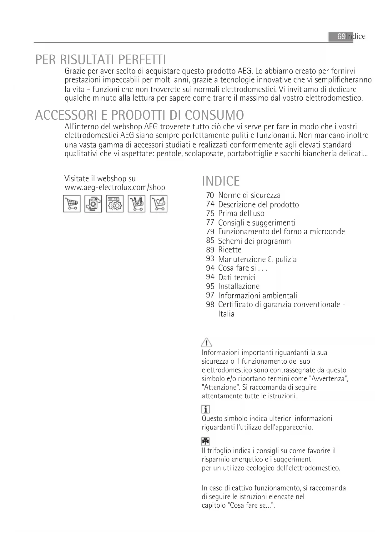 All'interno del webshop AEG troverete tutto ciò che vi serve per fare in modo che i vostri elettrodomestici AEG siano sempre perfettamente puliti e funzionanti. Non mancano inoltre una vasta gamma di accessori studiati e realizzati conformemente agli elevati standard qualitativi che vi aspettate: pentole, scolaposate, portabottiglie e sacchi biancheria delicati... Informazioni importanti riguardanti la sua sicurezza o il funzionamento del suo elettrodomestico sono contrassegnate da questo simbolo e/o riportano termini come "Avvertenza", "Attenzione". Si raccomanda di seguire attentamente tutte le istruzioni. Questo simbolo indica ulteriori informazioni riguardanti l'utilizzo dell'apparecchio. Il trifoglio indica i consigli su come favorire il risparmio energetico e i suggerimenti per un utilizzo ecologico dell'elettrodomestico. In caso di cattivo funzionamento, si raccomanda di seguire le istruzioni elencate nel capitolo "Cosa fare se…". INDICE Visitate il webshop su www.aeg-electrolux.com/shop