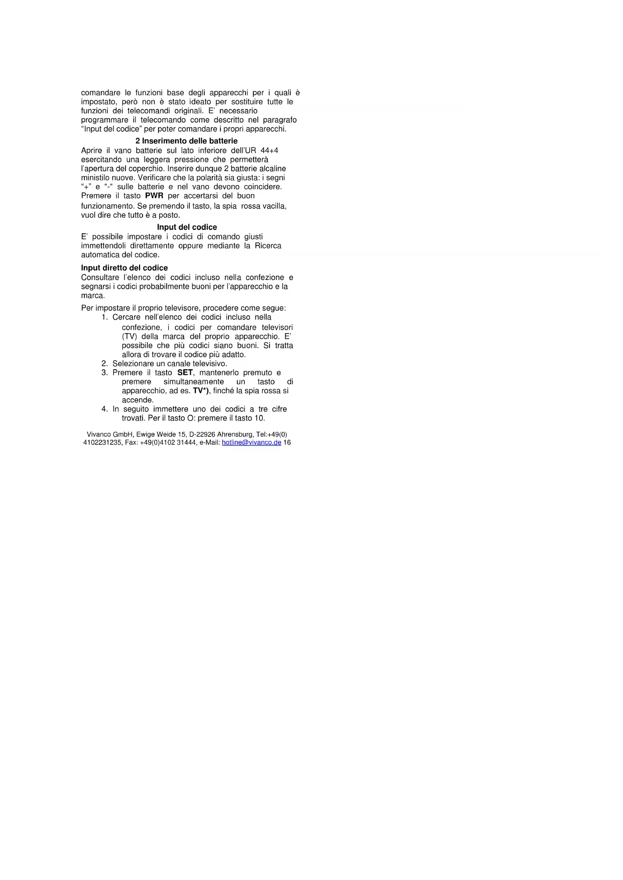está correcto, puede ajustar el telemando según indicado bajo los pasos 1 hasta 6 para controlar otros aparatos con ello. Entonces, en vez de la tecla TV*) presione la tecla de aparato SAT*), DVD*) o VCR*). En el caso de que el funcionamiento no esté correcto, debe seguir buscando otro código según indicado bajo 1 hasta 6. 4 Control de aparato Para mandar un aparato especial, primero debe presionar una tecla de aparato, p.ej. TV para mandar el televisor y después las teclas de función requeridas. Regulación de volumen Para ciertos aparatos que no disponen de una directa regulación de volumen, videograbador, DVD, etc. puede controlar el volumen del televisor sin Tenor que presionar antes la tecla TV*) (Punch Through). 5 Hot-line En el caso de que tenga preguntas respecto al UR 44+4 llame la hot-line de Vivanco: telf: 093 8483520. (I) Istruzioni per l’uso Vivanco Telecomando universale UR 44 per comandare quasi tutti i televisori, i ricevitori satellitari, i lettori e i masterizzatori di DVD, i lettori di CD ed altri apparecchi comandabili ad infrarossi. 1 Importante – leggere attentamente Vivanco UR 44+4 è preprogrammato per il comando di massimo 8 apparecchi, per sostituire telecomandi originali danneggiati o smarriti. Il telecomando è in grado diVivanco GmbH, Ewige Weide 15, D-22926 Ahrensburg, Tel:+49(0) 4102231235, Fax: +49(0)4102 31444, e-Mail: hotline@vivanco.de 16 comandare le funzioni base degli apparecchi per i quali è impostato, però non è stato ideato per sostituire tutte le funzioni dei telecomandi originali. E’ necessario programmare il telecomando come descritto nel paragrafo “Input del codice” per poter comandare i propri apparecchi. 2 Inserimento delle batterie Aprire il vano batterie sul lato inferiore dell’UR 44+4 esercitando una leggera pressione che permetterà l’apertura del coperchio. Inserire dunque 2 batterie alcaline ministilo nuove. Verificare che la polarità sia giusta: i segni “+” e “-“ sulle batterie e nel vano devono coincidere. Premere il tasto PWR per accertarsi del buon funzionamento. Se premendo il tasto, la spia rossa vacilla, vuol dire che tutto è a posto. Input del codice E’ possibile impostare i codici di comando giusti immettendoli direttamente oppure mediante la Ricerca automatica del codice. Input diretto del codice Consultare l’elenco dei codici incluso nella confezione e segnarsi i codici probabilmente buoni per l’apparecchio e la marca. Per impostare il proprio televisore, procedere come segue: