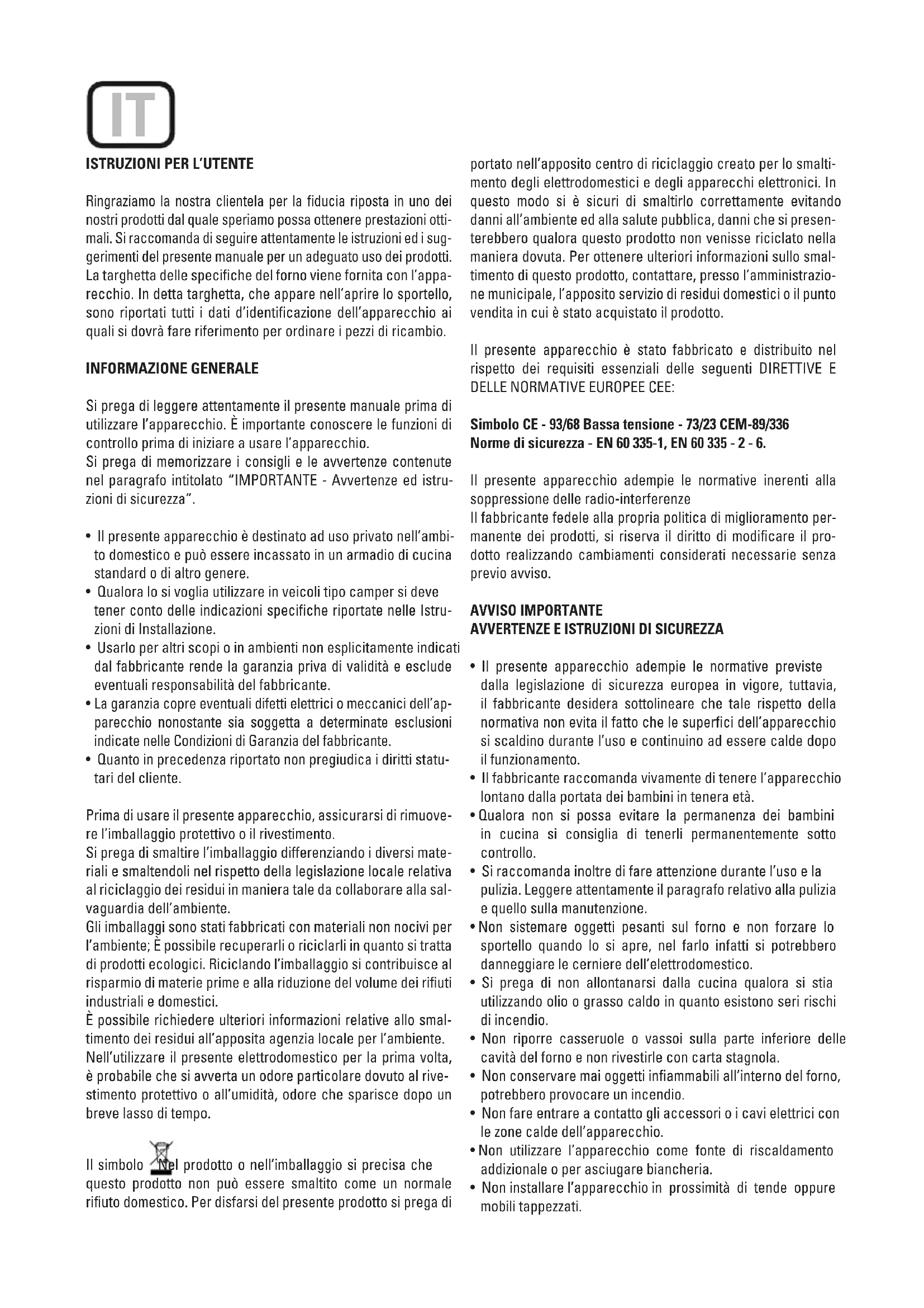 typeH07RN-F<HAR> Oven light bulb: 15W-25W/300ºCscrewtypeE-14 The Manufacturer declines all liability for damage caused to persons and objects due to incorrect or improper installation of the appliance. The Manufacturer reserves the right to make any modification it believes necessary and useful to the products, without prior warning.ISTRUZIONI PER L’UTENTE Ringraziamo la nostra clientela per la fiducia riposta in uno dei nostri prodotti dal quale speriamo possa ottenere prestazioni otti- mali. Si raccomanda di seguire attentamente le istruzioni ed i sug- gerimenti del presente manuale per un adeguato uso dei prodotti. La targhetta delle specifiche del forno viene fornita con l’appa- recchio. In detta targhetta, che appare nell’aprire lo sportello, sono riportati tutti i dati d’identificazione dell’apparecchio ai quali si dovrà fare riferimento per ordinare i pezzi di ricambio. INFORMAZIONE GENERALE Si prega di leggere attentamente il presente manuale prima di utilizzare l’apparecchio. È importante conoscere le funzioni di controllo prima di iniziare a usare l’apparecchio. Si prega di memorizzare i consigli e le avvertenze contenute nel paragrafo intitolato “IMPORTANTE - Avvertenze ed istru- zioni di sicurezza”.