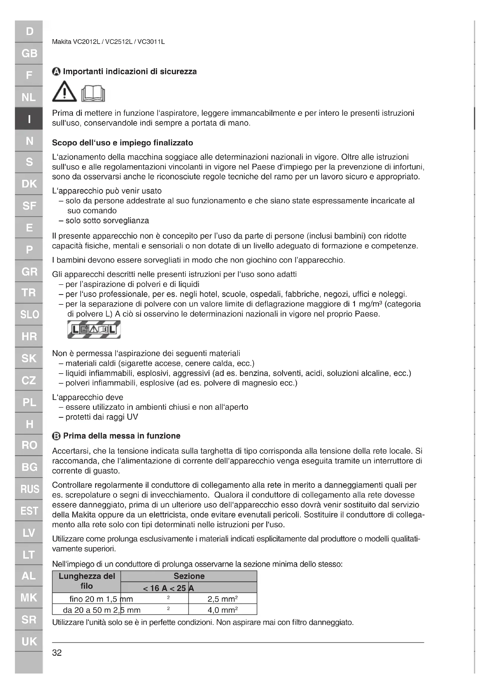 Makita VC2012L / VC2512L / VC3011L Importanti indicazioni di sicurezza Prima di mettere in funzione l‘aspiratore, leggere immancabilmente e per intero le presenti istruzioni sull‘uso, conservandole indi sempre a portata di mano. Scopo dell‘uso e impiego finalizzato L‘azionamento della macchina soggiace alle determinazioni nazionali in vigore. Oltre alle istruzioni sull‘uso e alle regolamentazioni vincolanti in vigore nel Paese d‘impiego per la prevenzione di infortuni, sono da osservarsi anche le riconosciute regole tecniche del ramo per un lavoro sicuro e appropriato. L‘apparecchio può venir usato – solo da persone addestrate al suo funzionamento e che siano state espressamente incaricate al suo comando – solo sotto sorveglianza Il presente apparecchio non è concepito per l’uso da parte di persone (inclusi bambini) con ridotte capacità fisiche, mentali e sensoriali o non dotate di un livello adeguato di formazione e competenze. I bambini devono essere sorvegliati in modo che non giochino con l’apparecchio. Gli apparecchi descritti nelle presenti istruzioni per l‘uso sono adatti – per l’aspirazione di polveri e di liquidi – per l‘uso professionale, per es. negli hotel, scuole, ospedali, fabbriche, negozi, uffici e noleggi. – per la separazione di polvere con un valore limite di deflagrazione maggiore di 1 mg/m³ (categoria di polvere L) A ciò si osservino le determinazioni nazionali in vigore nel proprio Paese. Non è permessa l‘aspirazione dei seguenti materiali – materiali caldi (sigarette accese, cenere calda, ecc.) – liquidi infiammabili, esplosivi, aggressivi (ad es. benzina, solventi, acidi, soluzioni alcaline, ecc.) – polveri infiammabili, esplosive (ad es. polvere di magnesio ecc.) L‘apparecchio deve – essere utilizzato in ambienti chiusi e non all‘aperto – protetti dai raggi UV Prima della messa in funzione Accertarsi, che la tensione indicata sulla targhetta di tipo corrisponda alla tensione della rete locale. Si raccomanda, che l‘alimentazione di corrente dell‘apparecchio venga eseguita tramite un interruttore di corrente di guasto. Controllare regolarmente il conduttore di collegamento alla rete in merito a danneggiamenti quali per es. screpolature o segni di invecchiamento. Qualora il conduttore di collegamento alla rete dovesse essere danneggiato, prima di un ulteriore uso dell‘apparecchio esso dovrà venir sostituito dal servizio della Makita oppure da un elettricista, onde evitare evenutali pericoli. Sostituire il conduttore di collega- mento alla rete solo con tipi determinati nelle istruzioni per l‘uso. Utilizzare come prolunga esclusivamente i materiali indicati esplicitamente dal produttore o modelli qualitati- vamente superiori. Nell‘impiego di un conduttore di prolunga osservarne la sezione minima dello stesso: Lunghezza del filo Sezione < 16 A < 25 A fino 20 m 1,5 mm