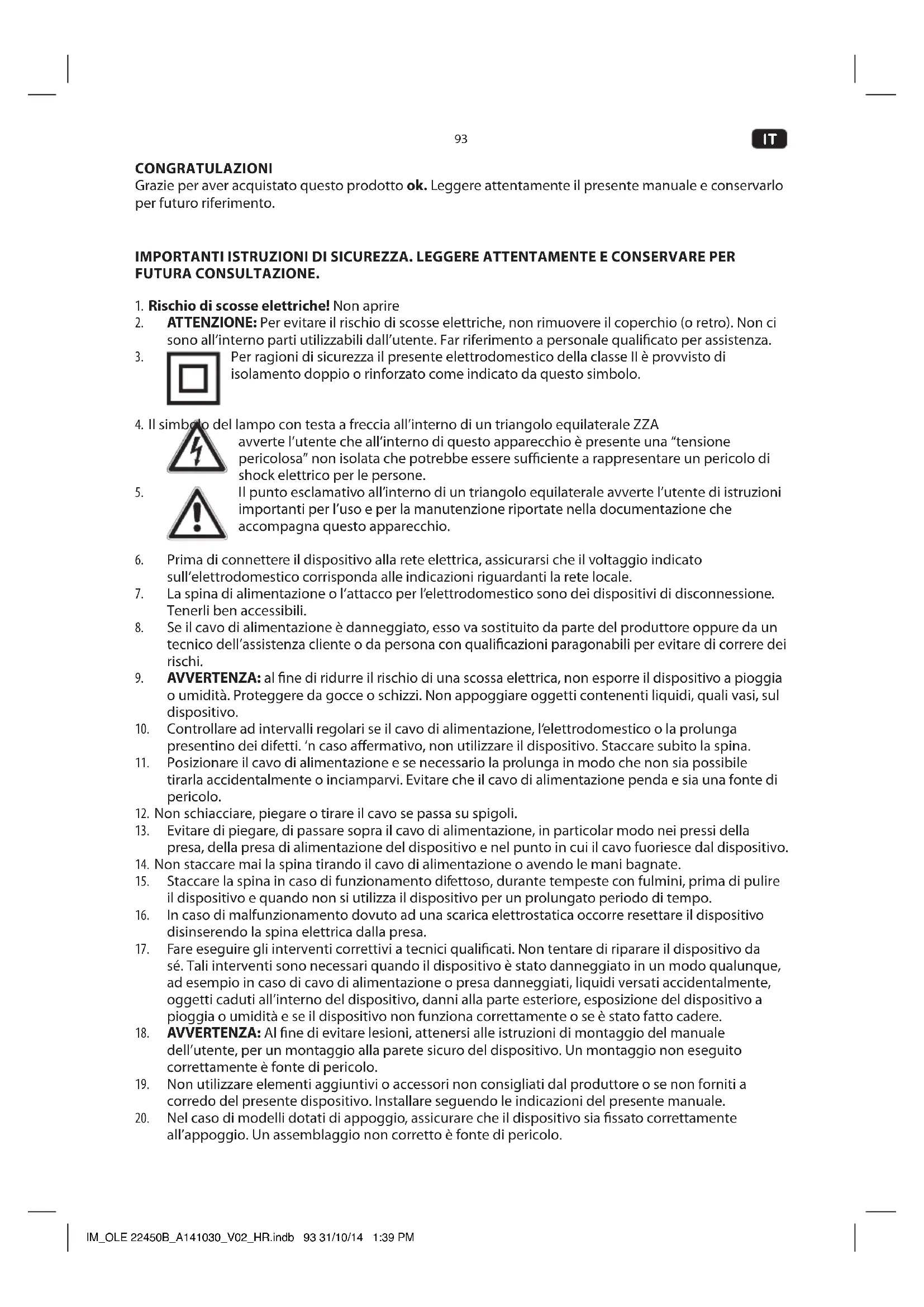USO PREVISTO Questo dispositivo è previsto per la ricezione e la riproduzione dei segnali audio, video e televisione. Usare solo secondo queste istruzioni. L’uso improprio è pericoloso e determinerà la non validità della garanzia. Rispettare le istruzioni di sicurezza. IM_OLE 22450B_A141030_V02_HR.indb 94 31/10/14 1:39 PM95
