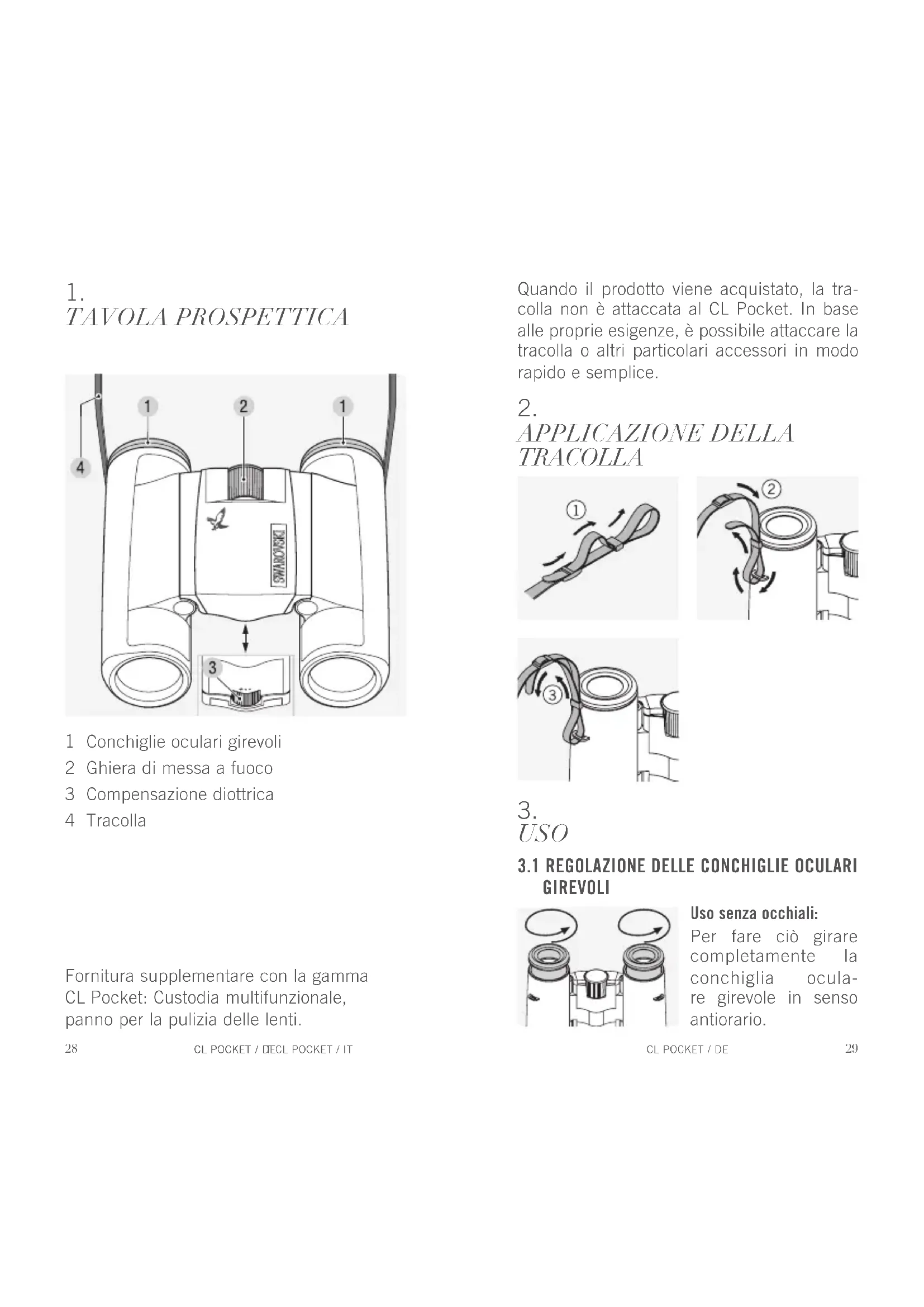 APPLICAZIONE DELLA TRACOLLA Quando il prodotto viene acquistato, la tra- colla non è attaccata al CL Pocket. In base alle proprie esigenze, è possibile attaccare la tracolla o altri particolari accessori in modo rapido e semplice. 1 Conchiglie oculari girevoli 2 Ghiera di messa a fuoco 3 Compensazione diottrica 4 Tracolla