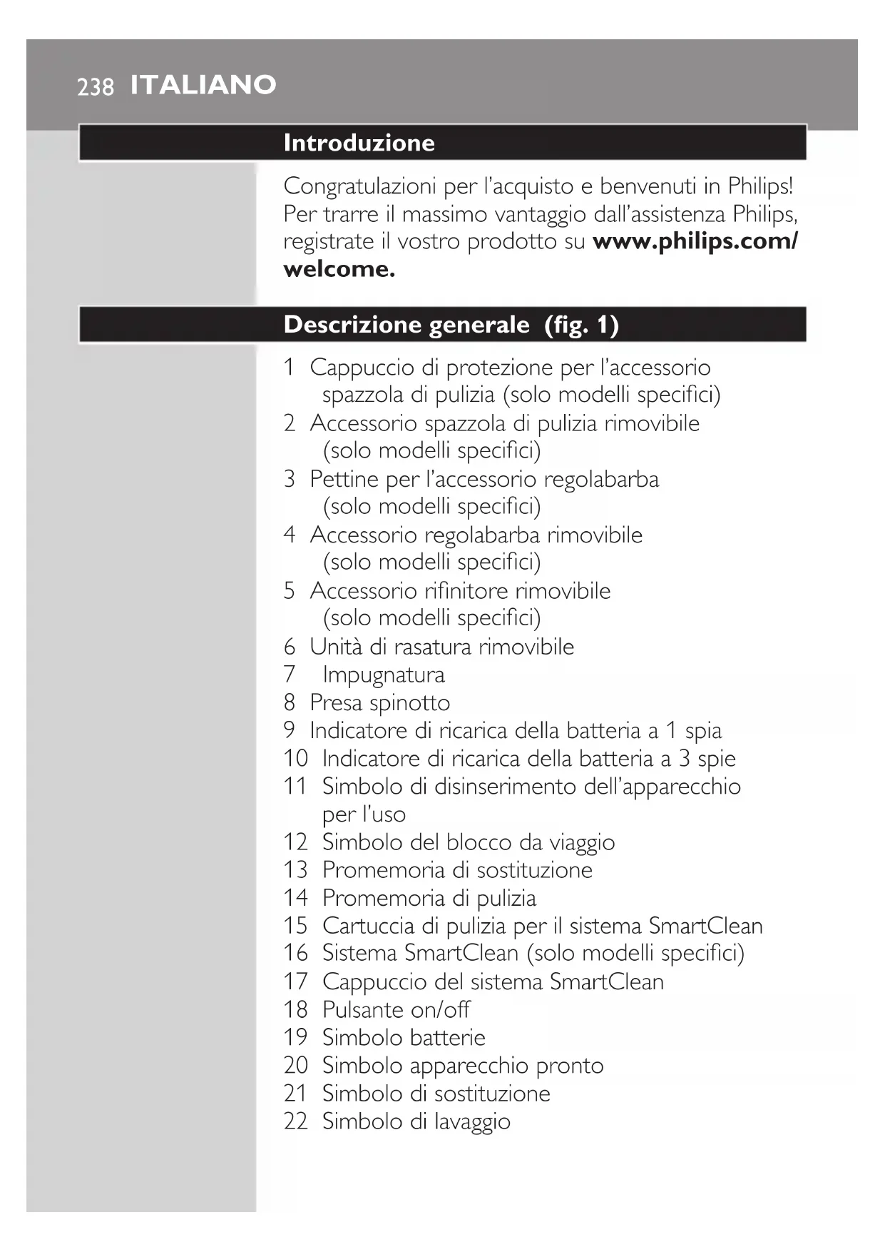 ITALIANO250Utilizzo dell’accessorio regolabarba senza il pettine Potete utilizzare l’accessorio regolabarba senza il pettine per denire il contorno di barba, baf, basette e nuca a una lunghezza di 0,5 mm. 1 Estraete il pettine dall’accessorio. Nota: afferrate la parte centrale del pettine per estrarla dall’accessorio. Non tirate il pettine dai lati. 2 Accendete l’apparecchio. 3 Potete iniziare a denire i contorni di barba, baf, basette o nuca muovendo lo styler verso il basso ed esercitando una leggera pressione, mentre lo tenete perpendicolare alla pelle. 4 Pulite l’accessorio dopo l’uso (vedere il capitolo “Pulizia e manutenzione”). Utilizzo dell’accessorio spazzola di pulizia Utilizzate l’accessorio spazzola di pulizia girevole insieme al detergente quotidiano. Tale accessorio rimuove il sebo e lo sporco, per una pelle sana e non lucida. 1 Inserite la linguetta dell’accessorio nella fessura sulla parte superiore dell’apparecchio. Quindi, premete l’accessorio verso il basso no a farlo scattare in posizione sull’apparecchio. 2 Inumidite l’accessorio con acqua. Non usate l’apparecchio con la testina asciutta, poiché potrebbe irritare la pelle. Consiglio: utilizzate l’accessorio prima della rasatura, per un più elevato livello di igiene e semplicità. ITALIANO 2513 Inumidite il viso con acqua e applicate un detergente sul viso. 4 Posizionate l’accessorio sulla guancia destra. 5 Accendete l’apparecchio. 6 Muovete delicatamente l’accessorio sulla pelle, dal naso verso l’orecchio. Afnché il trattamento non risulti sgradevole, non esercitate troppa pressione sulla pelle. 7 Dopo circa 20 secondi, spostate l’apparecchio sulla guancia sinistra e iniziate a eseguire la pulizia. Attenzione: non pulite la zona sensibile attorno agli occhi. 8 Dopo circa 20 secondi, spostate l’accessorio sulla fronte e iniziate a eseguire la pulizia. Muovete delicatamente la testina da sinistra a destra. Nota: Vi consigliamo di non eccedere nella pulizia e di non prolungare la pulizia di una zona per più di 20 secondi. 9 Al termine del trattamento, sciacquate e asciugate il viso che ora è pronto per il passaggio successivo della vostra routine quotidiana di cura della pelle. 10 Pulite l’accessorio dopo l’uso (vedere il capitolo “Pulizia e manutenzione”). 20 sec. 20 sec. 20 sec. ITALIANO252Pulizia e manutenzione Nota: Gli accessori forniti potrebbero essere diversi in base ai prodotti. La confezione mostra gli accessori forniti con l’apparecchio. Pulizia del rasoio con sistema SmartClean (solo modelli specici) non inclinate il sistema SmartClean per evitare la fuoriuscita di liquido. Nota: tenete saldamente in mano il sistema SmartClean mentre lo preparate per l’uso. Nota: se pulite il rasoio con il sistema SmartClean una volta a settimana, la cartuccia SmartClean durerà circa tre mesi. Preparazione all’uso del sistema SmartClean 1 Inserite lo spinotto nella parte posteriore del sistema SmartClean. 2 Inserite la spina dell’adattatore nella presa di corrente a muro. 3 Premete il pulsante a lato del sistema SmartClean ed estraete la parte superiore del sistema. 4 Rimuovete il sigillo dalla cartuccia di pulizia.