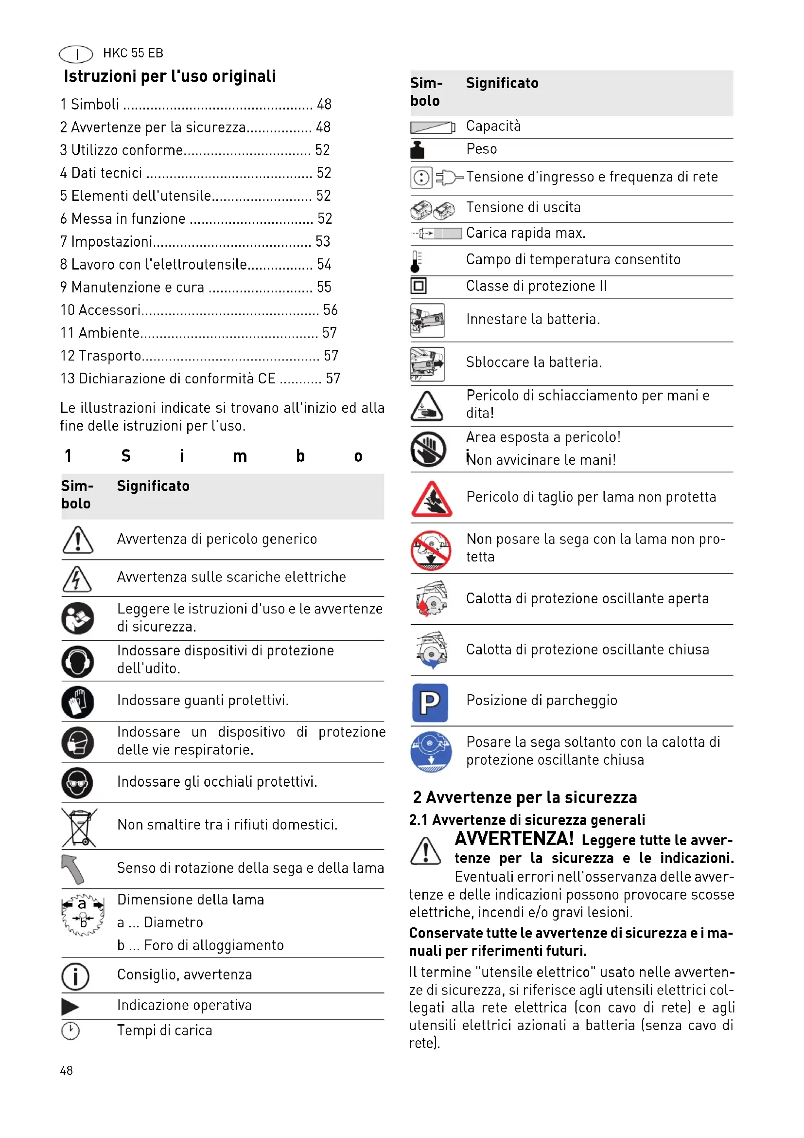 - AVVERTENZA! Leggere tutte le avver- tenze per la sicurezza e le indicazioni. Eventuali errori nell'osservanza delle avver- tenze e delle indicazioni possono provocare scosse elettriche, incendi e/o gravi lesioni. Conservate tutte le avvertenze di sicurezza e i ma- nuali per riferimenti futuri. Il termine "utensile elettrico" usato nelle avverten- ze di sicurezza, si riferisce agli utensili elettrici col- legati alla rete elettrica (con cavo di rete) e agli utensili elettrici azionati a batteria (senza cavo di rete). 1 Simboli p. 48