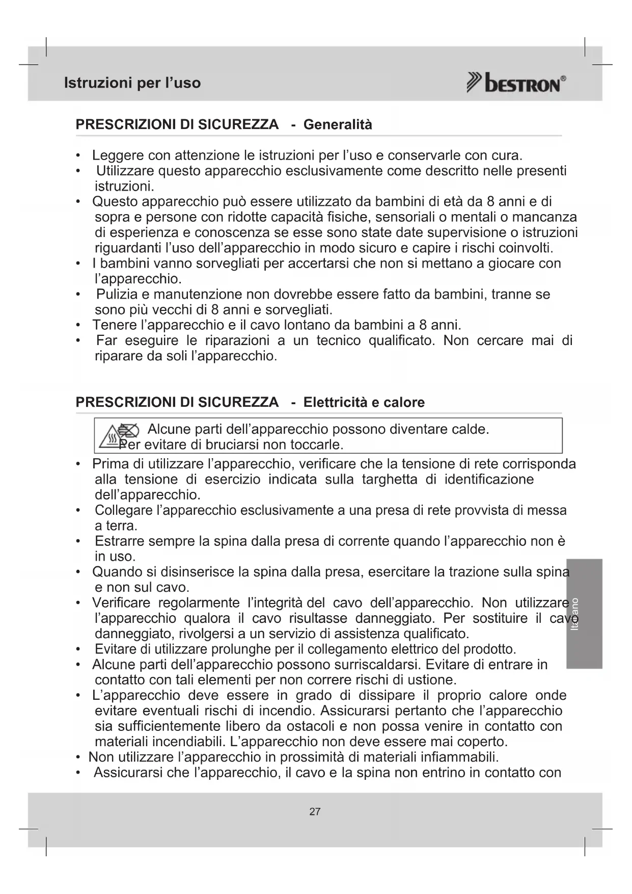 SERVIZIO Qualora dovesse verificarsi un guasto è possibile mettersi in contatto con il servizio clienti BESTRON: www.bestron.com/service