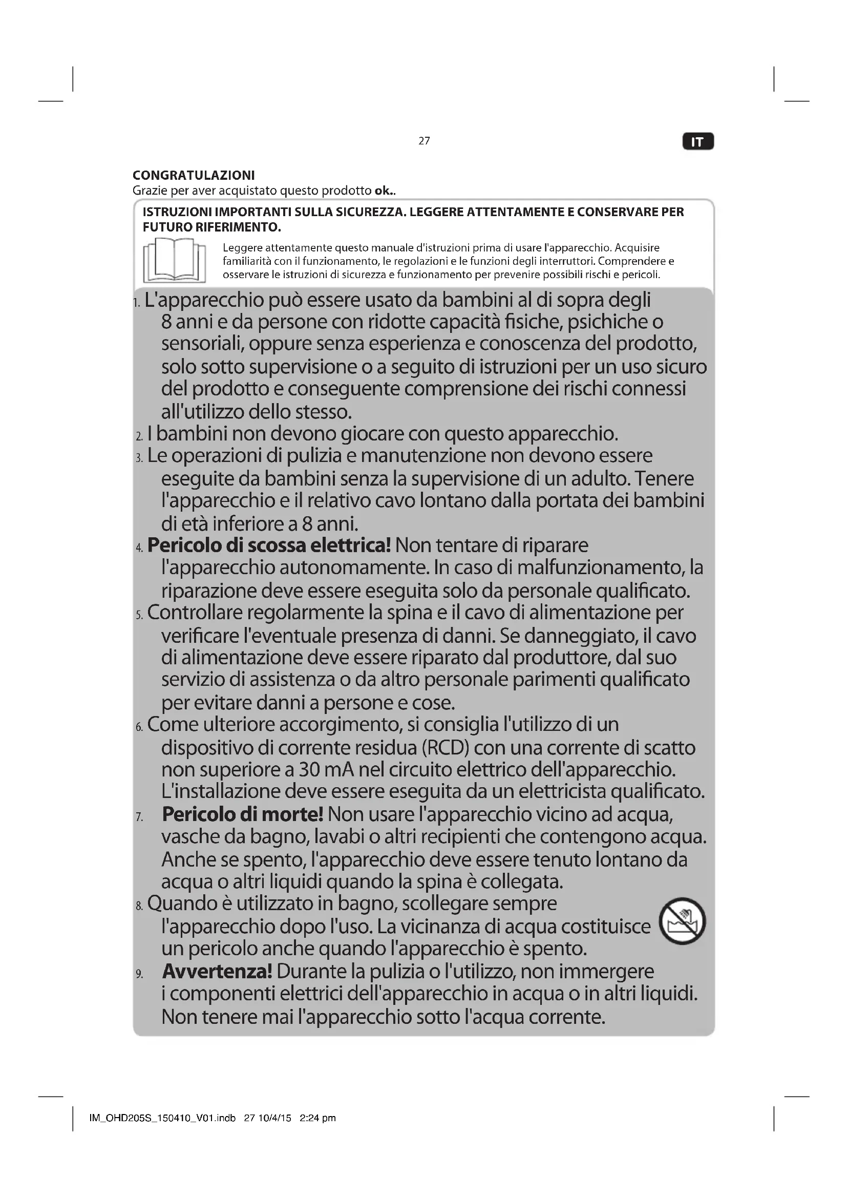 - L'apparecchio può essere usato da bambini al di sopra degli 8 anni e da persone con ridotte capacità fisiche, psichiche o sensoriali, oppureswana esperienza e conoscenza del prodotto, solo quello supervisione o a seguito di istruzioni per un uso sicuro del prodotto e consequences comprenzione dei rischi connessi all'utilizzo dello stesso.