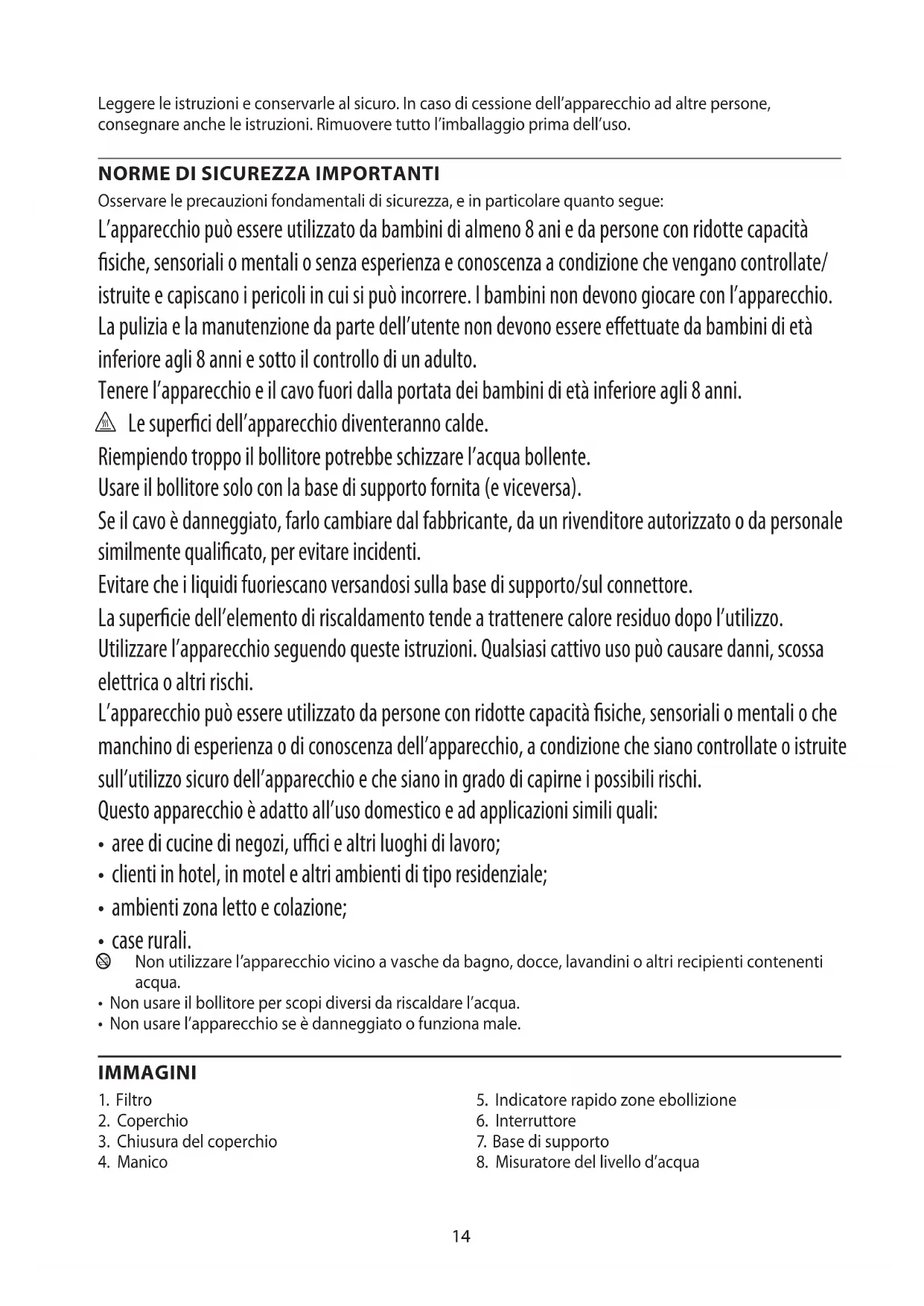 Osservare le precauzioni fondamentali di sicurezza, e in particolare quanto segue: L’apparecchio può essere utilizzato da bambini di almeno 8 ani e da persone con ridotte capacità fisiche, sensoriali o mentali o senza esperienza e conoscenza a condizione che vengano controllate/ istruite e capiscano i pericoli in cui si può incorrere. I bambini non devono giocare con l’apparecchio. La pulizia e la manutenzione da parte dell’utente non devono essere effettuate da bambini di età inferiore agli 8 anni e sotto il controllo di un adulto. Tenere l’apparecchio e il cavo fuori dalla portata dei bambini di età inferiore agli 8 anni. h Le superfici dell’apparecchio diventeranno calde. Riempiendo troppo il bollitore potrebbe schizzare l’acqua bollente. Usare il bollitore solo con la base di supporto fornita (e viceversa). Se il cavo è danneggiato, farlo cambiare dal fabbricante, da un rivenditore autorizzato o da personale similmente qualificato, per evitare incidenti. Evitare che i liquidi fuoriescano versandosi sulla base di supporto/sul connettore. La superficie dell’elemento di riscaldamento tende a trattenere calore residuo dopo l’utilizzo. Utilizzare l’apparecchio seguendo queste istruzioni. Qualsiasi cattivo uso può causare danni, scossa elettrica o altri rischi. L’apparecchio può essere utilizzato da persone con ridotte capacità fisiche, sensoriali o mentali o che manchino di esperienza o di conoscenza dell’apparecchio, a condizione che siano controllate o istruite sull’utilizzo sicuro dell’apparecchio e che siano in grado di capirne i possibili rischi. Questo apparecchio è adatto all’uso domestico e ad applicazioni simili quali: