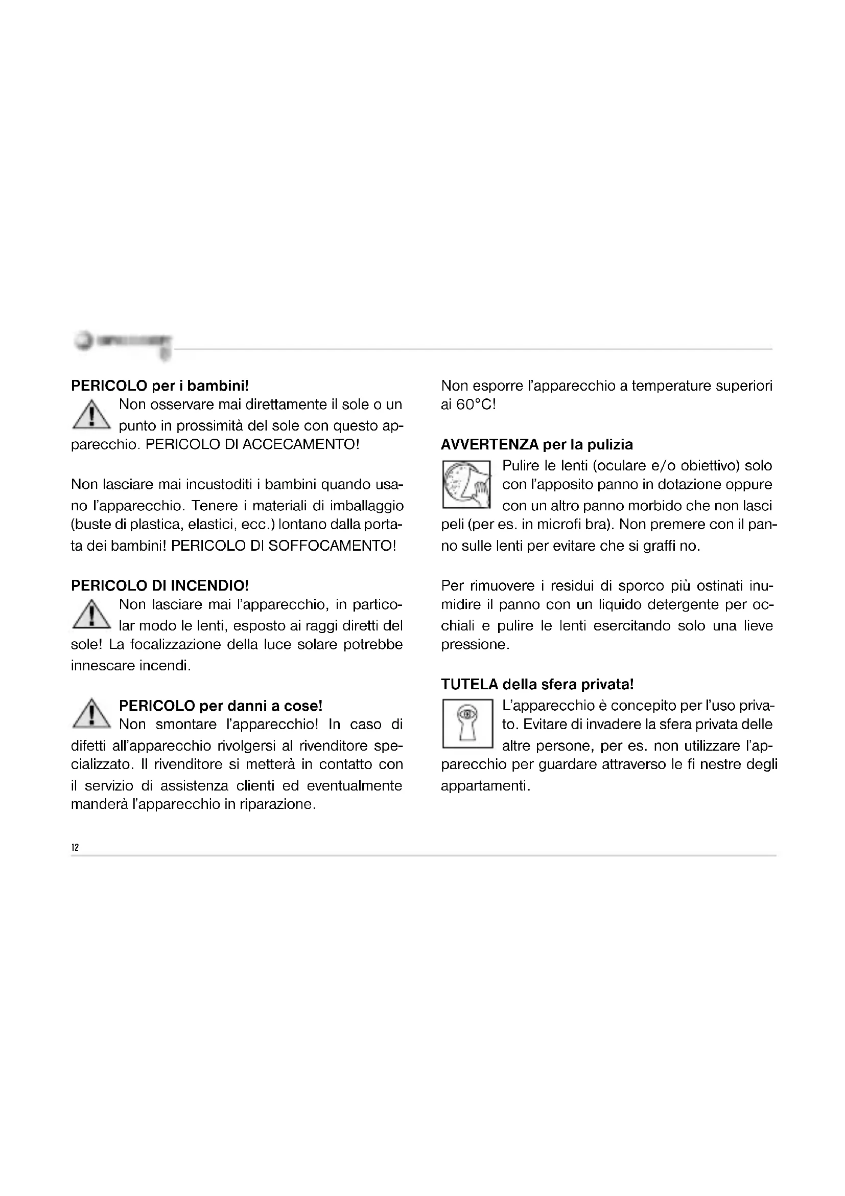 kijker-as zo indrukken dat je als je erdoorheen kijkt maar één blikveld kunt zien (Fig. 2). De scherpstelling Zoek eerst een voorwerp dat meer dan 10 meter van je is verwijderd. Om een scherp beeld van dit voorwerp te krijgen, kijk je eerst met beide ogen door de inkijklenzen (2). Draai nu met een vinger aan de scherpstelknop (Fig. 3, 1) tot het beeld dat je ziet er helder en heel duidelijk uitziet.12 Non esporre l’apparecchio a temperature superiori ai 60°C! AVVERTENZA per la pulizia Pulire le lenti (oculare e/o obiettivo) solo con l’apposito panno in dotazione oppure con un altro panno morbido che non lasci peli (per es. in microfi bra). Non premere con il pan- no sulle lenti per evitare che si graffi no. Per rimuovere i residui di sporco più ostinati inu- midire il panno con un liquido detergente per oc- chiali e pulire le lenti esercitando solo una lieve pressione. TUTELA della sfera privata! L’apparecchio è concepito per l’uso priva- to. Evitare di invadere la sfera privata delle altre persone, per es. non utilizzare l’ap- parecchio per guardare attraverso le fi nestre degli appartamenti. PERICOLO per i bambini! Non osservare mai direttamente il sole o un punto in prossimità del sole con questo ap- parecchio. PERICOLO DI ACCECAMENTO! Non lasciare mai incustoditi i bambini quando usa- no l’apparecchio. Tenere i materiali di imballaggio (buste di plastica, elastici, ecc.) lontano dalla porta- ta dei bambini! PERICOLO DI SOFFOCAMENTO! PERICOLO DI INCENDIO! Non lasciare mai l’apparecchio, in partico- lar modo le lenti, esposto ai raggi diretti del sole! La focalizzazione della luce solare potrebbe innescare incendi. PERICOLO per danni a cose! Non smontare l’apparecchio! In caso di difetti all’apparecchio rivolgersi al rivenditore spe- cializzato. Il rivenditore si metterà in contatto con il servizio di assistenza clienti ed eventualmente manderà l’apparecchio in riparazione.13 SMALTIMENTO Smaltire i materiali di imballaggio dopo averli suddivisi. Per informazioni sul corretto smalti- mento, si prega di rivolgersi all‘azienda municipale che si occupa dello smaltimento dei rifi uti o all’uffi - cio pubblico competente. Sommario