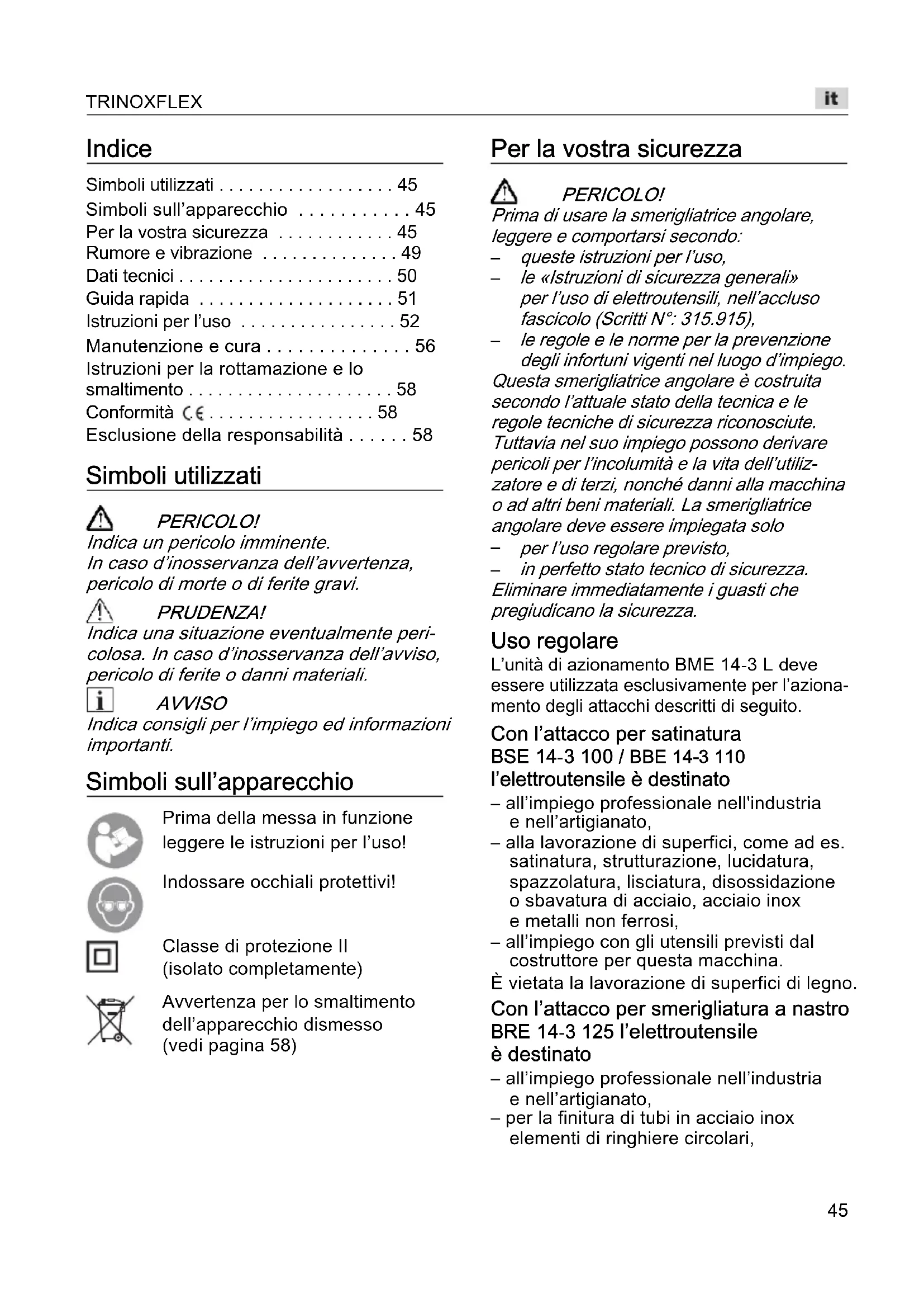 l’elettroutensile è destinato – all’impiego professionale nell'industria e nell’artigianato,– alla lavorazione di superfici, come ad es. satinatura, strutturazione, lucidatura, spazzolatura, lisciatura, disossidazione o sbavatura di acciaio, acciaio inox e metalli non ferrosi,– all’impiego con gli utensili previsti dal costruttore per questa macchina.È vietata la lavorazione di superfici di legno. Con l’attacco per smerigliatura a nastro BRE 14-3 125 l’elettroutensile è destinato – all’impiego professionale nell’industria e nell’artigianato,– per la finitura di tubi in acciaio inox elementi di ringhiere circolari,TRINOXFLEX