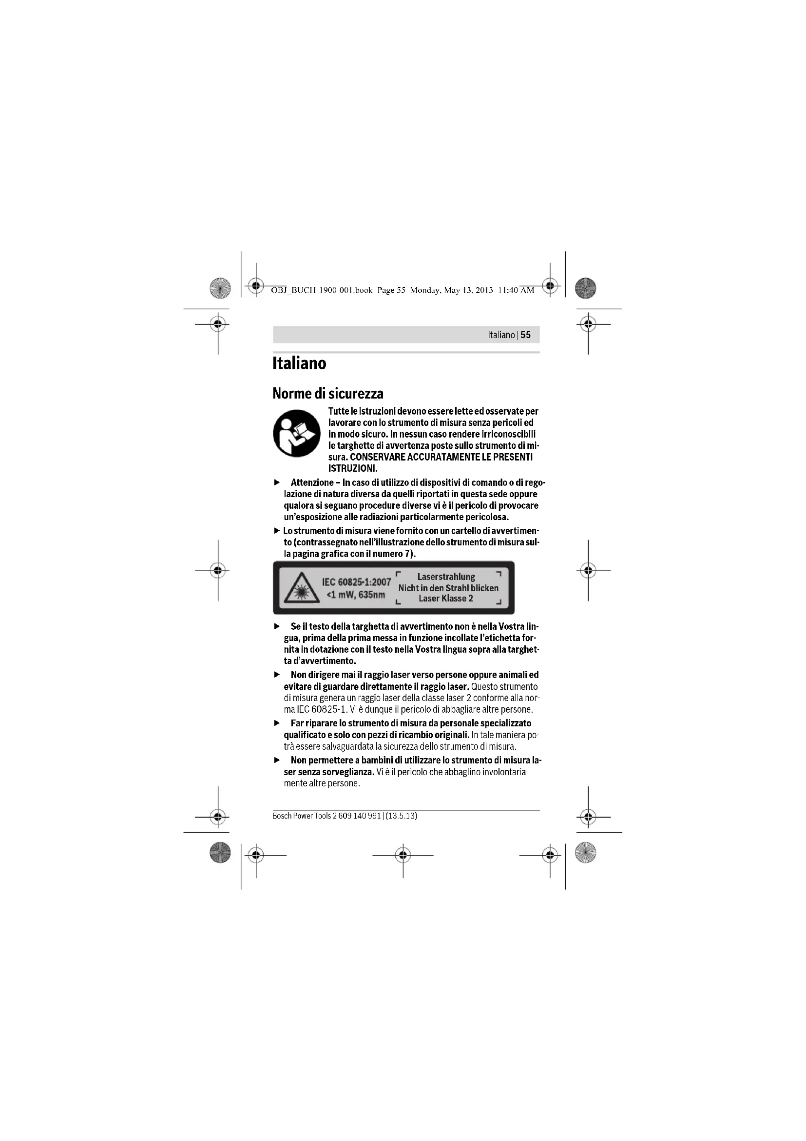 Peso in funzione della EPTA-Procedure 01/2003 0,1 kg Misure 100x36x23mm A) La portata aumenterà quanto migliore sarà il riflesso del raggio laser dalla superficie dell’obiettivo (in dispersione, non in rispecchiamento) e quanto più luminoso sarà il punto laser rispetto alla luminosità ambiente (ambienti interni, semibuio). In condizio- ni sfavorevoli, quali ades. illuminazione interna molto intensa o superfici fortemente riflettenti, il campo di misurazione potrà risultare limitato. B) In condizioni sfavorevoli, quali ades. illuminazione interna molto intensa, superfici fortemente riflettenti o temperatura ambiente molto diversa da 25 ° C, lo scostamento massimo potrà essere di ±7 mm su 15 m. In condizioni favorevoli è prevedibile un in- flusso di ±0,05 mm/m. Per un’inequivocabile identificazione del Vostro strumento di misura fate riferimento al numero di serie 6 riportato sulla targhetta di costruzione. OBJ_BUCH-1900-001.book Page 57 Monday, May 13, 2013 11:40 AM58 | Italiano 2 609 140 991 | (13.5.13) Bosch Power Tools Montaggio Applicazione/sostituzione delle batterie Per il funzionamento dello strumento di misura si consiglia l’impiego dei batterie alcaline al manganese. Per aprire il coperchio del vano batteria 4, spingere sul fissaggio 5 nella direzione della freccia e prelevare il coperchio del vano batteria. Introdur- re le batterie. Durante tale fase, prestare attenzione alla corretta polarità, riportata sul lato interno del vano batteria. Quando sul display verrà visualizzato il simbolo della batteria, si di- sporrà ancora di circa 15 minuti per effettuare misurazioni. Quando il sim- bolo della batteria lampeggerà, le batterie andranno sostituite e non sarà più possibile effettuare misurazioni. Sostituire sempre tutte le batterie contemporaneamente. Utilizzare esclusivamente batterie dello stesso produttore e con la stessa capacità. In caso di non utilizzo per periodi di tempo molto lunghi, estrarre le batterie dallo strumento di misura. In caso di periodi di deposito molto lunghi, le batterie possono subire corrosioni oppure e si possono scaricare. Uso Messa in funzione Non lasciare mai lo strumento di misura senza custodia quando è acceso ed avere cura di spegnere lo strumento di misura subito do- po l’utilizzo. Vi è il pericolo che altre persone potrebbero essere abba- gliate dal raggio laser. Proteggere lo strumento di misura da liquidi e dall’esposizione di- retta ai raggi solari. Non esporre mai lo strumento di misura a temperature oppure a sbalzi di temperatura estremi. P.es. non lasciarlo per lungo tempo in macchina. In caso di elevati sbalzi di temperatura lasciare adattare alla temperatura ambientale lo strumento di misura prima di metterlo in funzione. Temperature oppure sbalzi di temperatura estremi possono pregiudicare la precisione dello strumento di misura. OBJ_BUCH-1900-001.book Page 58 Monday, May 13, 2013 11:40 AMItaliano | 59 Bosch Power Tools 2 609 140 991 | (13.5.13) Evitare di urtare violentemente o di far cadere lo strumento di mi- sura. A seguito di forti influssi esterni sullo strumento di misura, effet- tuare sempre un controllo prima di proseguire il lavoro (vedere «Con- trollo dello strumento di misura», pagina 62). Accensione/spegnimento Per accendere lo strumento di misura, far scorrere l’interruttore di avvio/ arresto 1 all’indietro. All’accensione dello strumento di misura verrà atti- vato il raggio laser. Sul display lampeggerà l’indicazione LASER. Per spegnere lo strumento di misura, far scorrere l’interruttore di avvio/ arresto 1 in avanti. Operazione di misura Una volta acceso lo strumento di misura, verrà effettuata una misurazione continua. Puntare con il raggio laser la superficie obiettivo. Il valore di mi- surazione attuale g verrà visualizzato nella riga in basso del display (vede- re immagine A). Durante la misurazione continua lo strumento di misura potrà essere spostato rispetto all’obiettivo; in tale caso, il valore di misu- razione attuale g verrà aggiornato ogni circa 0,5 secondi, nella riga in bas- so del display (vedere immagine B). Potrete, ad esempio, allontanarvi da una parete fino alla distanza desiderata: la distanza attuale resterà sem- pre leggibile. Sul display lampeggerà l’indicazione LASER. Il punto di partenza della misura è il lato posteriore dello strumento di mi- sura. Per una misurazione da parete a parete, ad esempio, sistemare lo stru- mento di misura con il lato posteriore sulla parete di partenza. Non dirigere mai il raggio laser su persone oppure su animali ed evitare di guardare direttamente il raggio laser anche da distanze maggiori. Funzione «HOLD» (vedere immagine B) Premere il tasto «HOLD» 2 per arrestare la mi- surazione. Il raggio laser verrà disattivato e sul display comparirà l’indicazione HOLD. Il valore di misurazione attuale verrà ancora visualizza- to nella riga in basso del display, ma non verrà più aggiornato in modo continuo. OBJ_BUCH-1900-001.book Page 59 Monday, May 13, 2013 11:40 AM60 | Italiano 2 609 140 991 | (13.5.13) Bosch Power Tools Premere nuovamente il tasto «HOLD» 2 per ri- attivare il laser. Sul display lampeggerà l’indi- cazione LASER. Nella riga in alto verrà visualiz- zato il valore di misurazione precedente. Nella riga in basso verrà visualizzato il valore aggior- nato in modo continuo/il valore attuale. Premere nuovamente il tasto «HOLD» 2 per ar- restare un’altra volta la misurazione. Il raggio laser verrà disattivato e sul display comparirà l’indicazione HOLD. Nella riga in alto verrà vi- sualizzato il valore di misurazione precedente. Nella riga in basso del display verrà visualizza- to il valore di misurazione attuale, ma esso non verrà più aggiornato in modo continuo. Se per ca. 5 min non viene premuto alcun tasto sullo strumento di misura, lo stesso si spegne automaticamente per proteggere le batterie. Se un valore di misurazione è stato memorizzato con la funzione «HOLD», in caso di