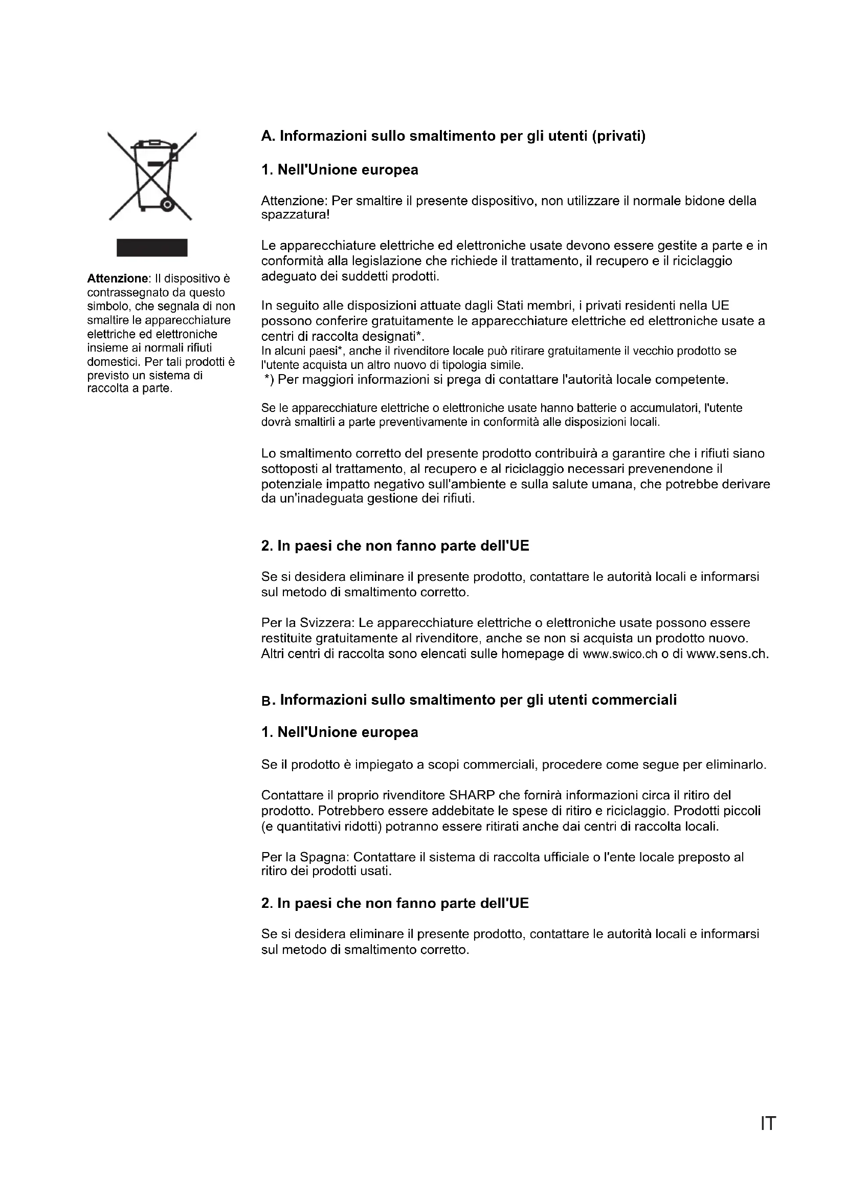 Se il prodotto è impiegato a scopi commerciali, procedere come segue per eliminarlo. Contattare il proprio rivenditore SHARP che fornirà informazioni circa il ritiro del prodotto. Potrebbero essere addebitate le spese di ritiro e riciclaggio. Prodotti piccoli (e quantitativi ridotti) potranno essere ritirati anche dai centri di raccolta locali. Per la Spagna: Contattare il sistema di raccolta ufficiale o l'ente locale preposto al ritiro dei prodotti usati.