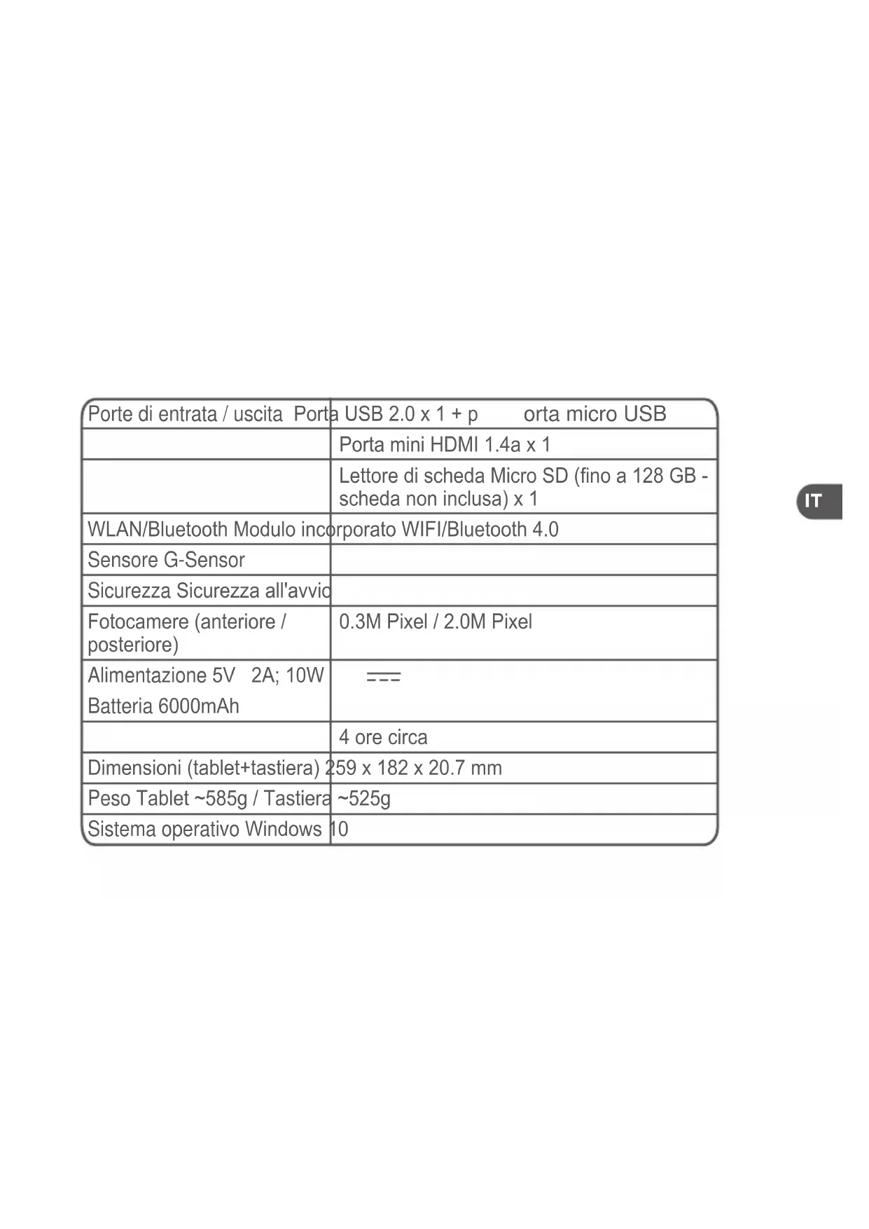 Porte di entrata / uscita Porta USB 2.0 x 1 + p orta micro USB Porta mini HDMI 1.4a x 1 Lettore di scheda Micro SD (no a 128 GB - scheda non inclusa) x 1 WLAN/Bluetooth Modulo incorporato WIFI/Bluetooth 4.0 Sensore G-Sensor Sicurezza Sicurezza all'avvio Fotocamere (anteriore / posteriore) 0.3M Pixel / 2.0M Pixel Alimentazione 5V 2A; 10W Batteria 6000mAh 4 ore circa Dimensioni (tablet+tastiera) 259 x 182 x 20.7 mm Peso Tablet ~585g / Tastiera ~525g Sistema operativo Windows 10IT