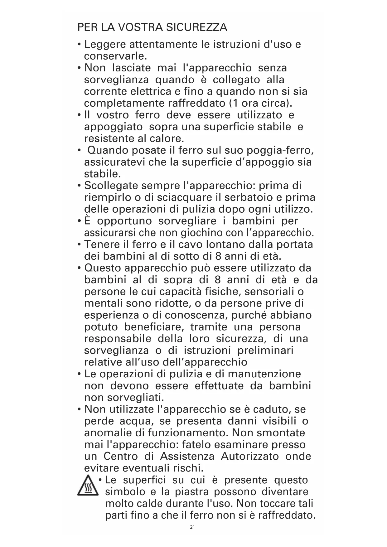 - Tenere il ferro e il cavo lontano dalla portata dei bambini al di sotto di 8 anni di età.