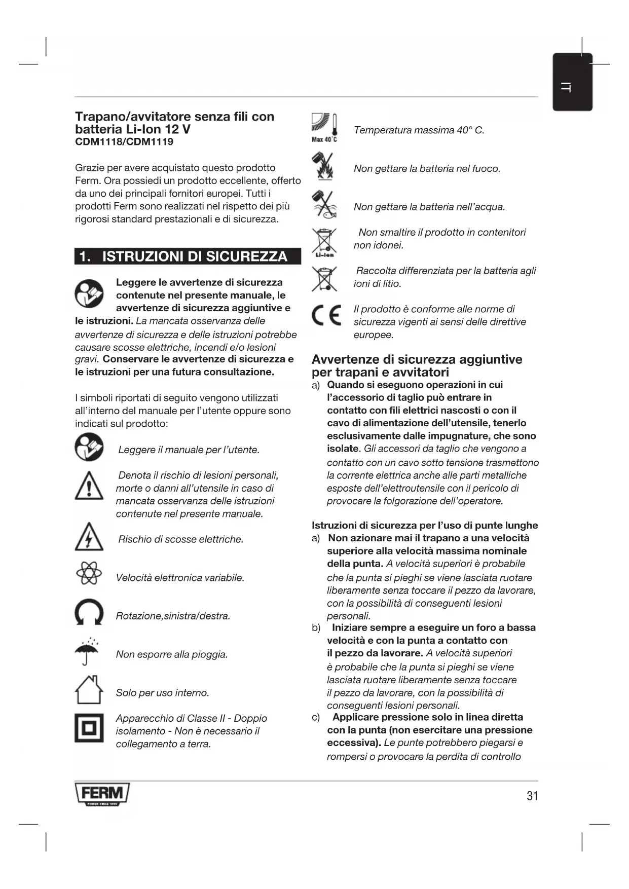 Trapano/avvitatore senza fili con batteria Li-Ion 12 V CDM1118/CDM1119 Grazie per avere acquistato questo prodotto Ferm. Ora possiedi un prodotto eccellente, offerto da uno dei principali fornitori europei. Tutti i prodotti Ferm sono realizzati nel rispetto dei più rigorosi standard prestazionali e di sicurezza.