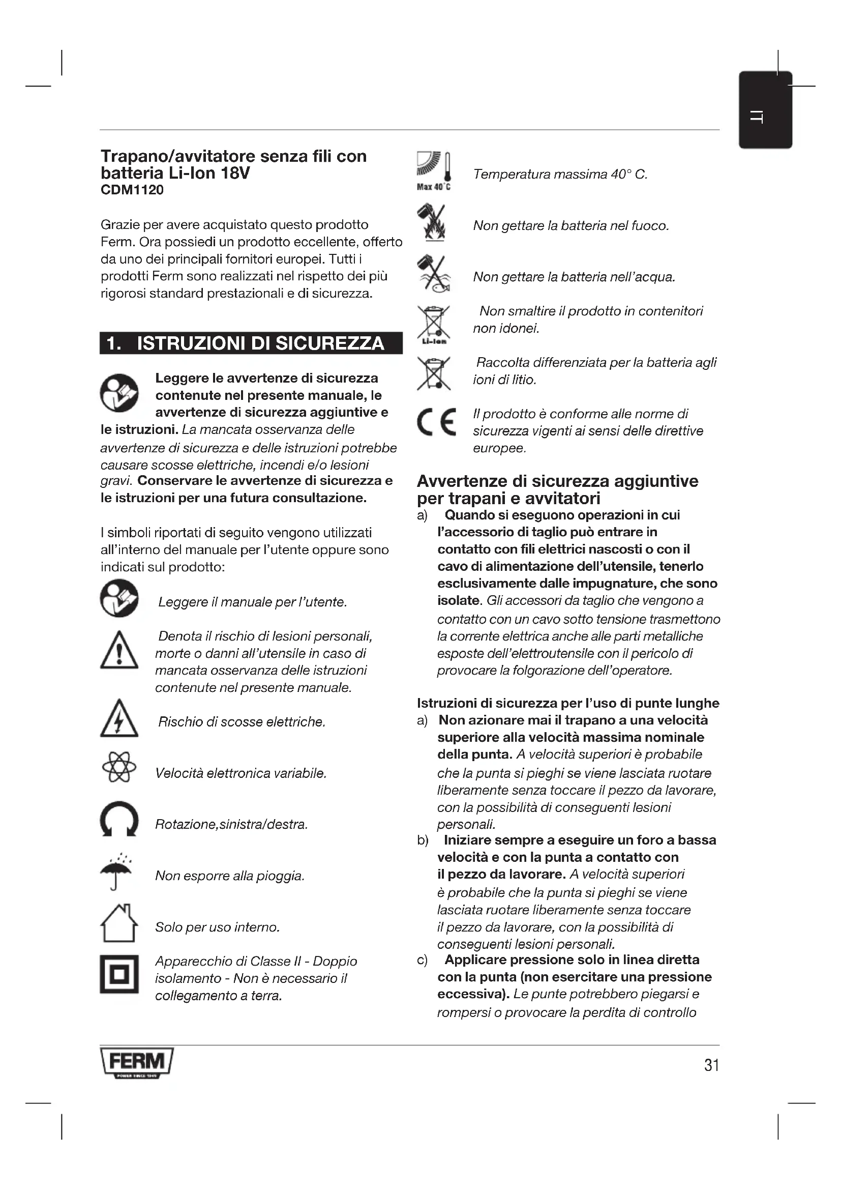 Trapano/avvitatore senza fili con batteria Li-Ion 18V CDM1120 Grazie per avere acquistato questo prodotto Ferm. Ora possiedi un prodotto eccellente, offerto da uno dei principali fornitori europei. Tutti i prodotti Ferm sono realizzati nel rispetto dei più rigorosi standard prestazionali e di sicurezza.