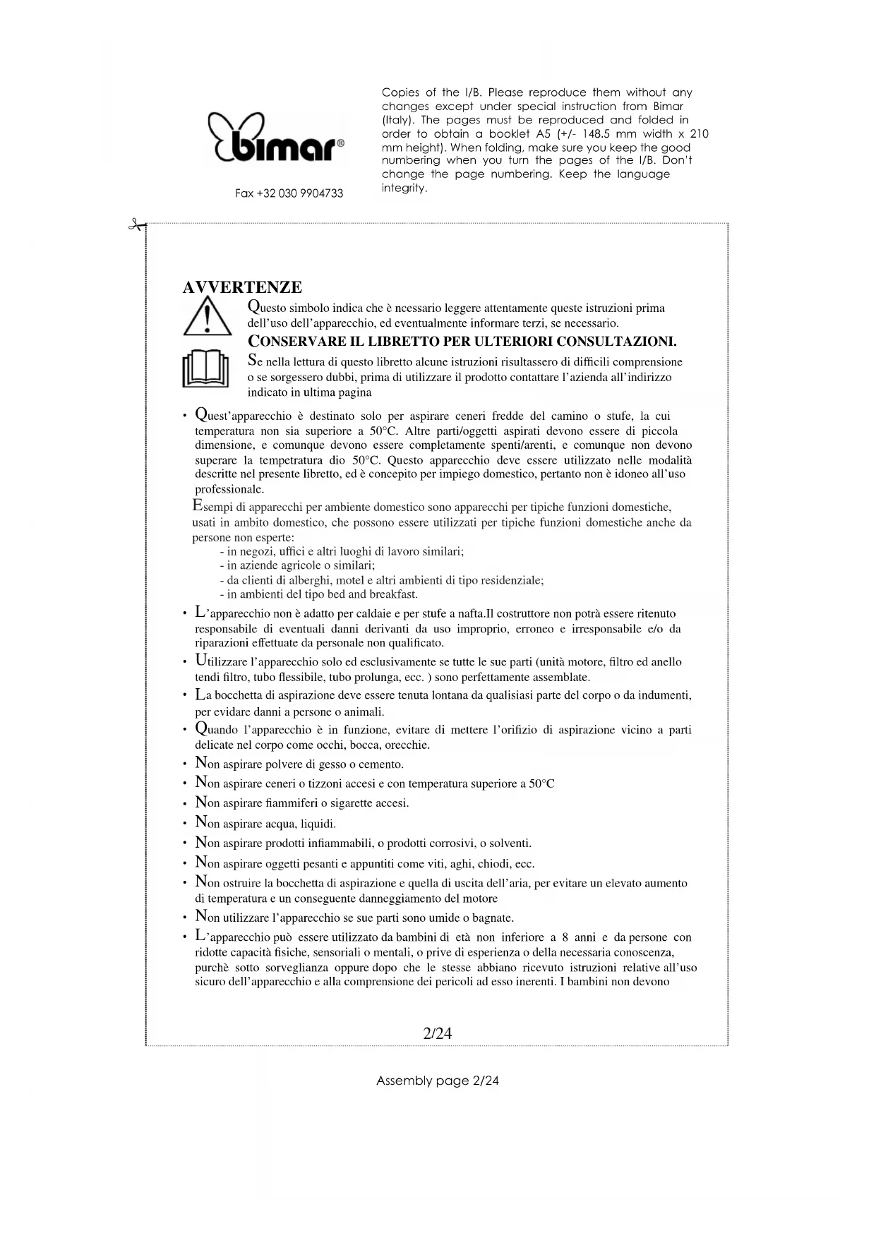 - Quest'appareccchio è destinato solo per aspirare ceneri fredde del camino o stufe, la cui temperatura non sia superiore a 50^ . Altre parti/oggetti aspirati devono essere di piccola dimensione, e comunque devono essere completamente spenti/arenti, e comunque non devono superare la temperatura dio 50^ . Questo apparccchio deve essere utilizzato nelle modalità descritte nel presente libretto, ed è concepito per impiego domestico, pertanto non è idoneo all'uso professionale.