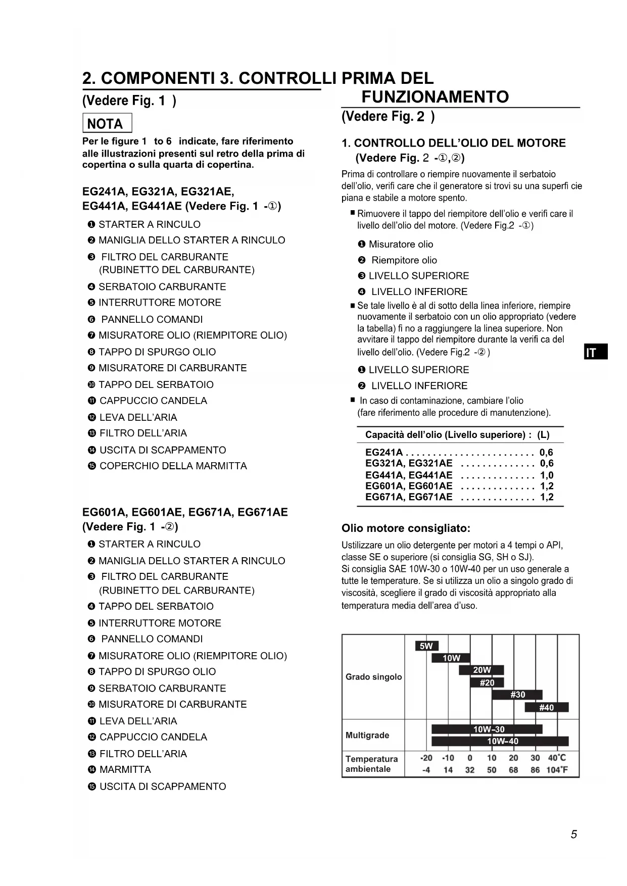 - ,2EG671A, EG671AE ,2 Olio motore consigliato: Ustilizzare un olio detergente per motori a 4 tempi o API, classe SE o superiore (si consiglia SG, SH o SJ). Si consiglia SAE 10W-30 o 10W-40 per un uso generale a tutte le temperature. Se si utilizza un olio a singolo grado di viscosità, scegliere il grado di viscosità appropriato alla temperatura media dell’area d’uso.TemperaturaambientaleGrado singoloMultigrade p. 1
