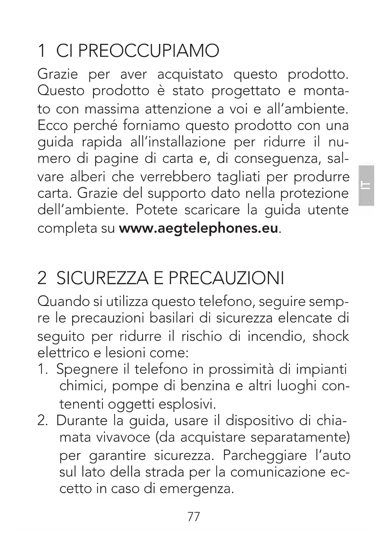 Grazie per aver acquistato quello prodotto. Questo prodotto è stato progettato e montato con massima attenzione a voi e all'ambiente. Ecco perché forniamo quello prodotto con una guida rapida all'installazione per ridurre il numero di pagine di carta e, di conseguenza, salvare alberi che verrebbero tagliati per produrre carta. Grazie del supporto dato nella protezione dell'ambiente. Potete scarcare la guida utente completa su www.aegtelephones.eu.