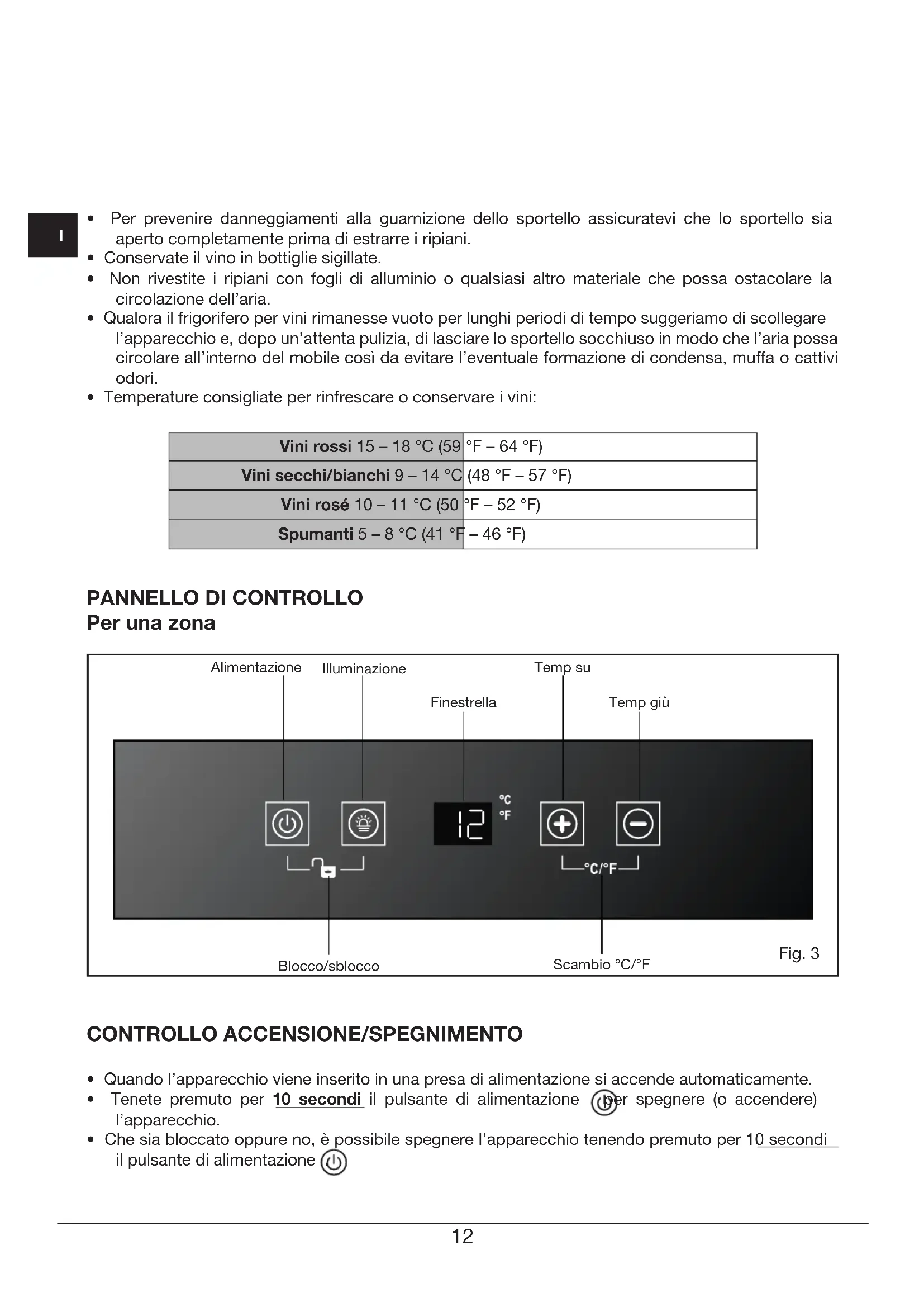 - La cifra cambia e indica la temperatura reale dell’interno dell’apparecchio dopo 10 secondi senza pressioni. Nota: La prima volta che si usa l’apparecchio o alla sua riaccensione dopo un lungo periodo di spegnimento è possibile notare uno scarto di alcuni gradi fra la temperatura impostata e quella mostrata. Questo fatto è normale e dopo poche ore di funzionamento l’apparecchio sarà perfettamente a regime. SELEZIONE DEI GRADI FAHRENHEIT (°F) E CELSIUS (°C) Per una zona Tenendo premuti per 5 secondi con 2 dita contemporaneamente i pulsanti è possibile scambiare sul display i gradi Fahrenheit e Celsius. Per due zone Premendo direttamente il pulsante è possibile scambiare sul display i gradi Fahrenheit e Celsius per entrambe le zone contemporaneamente.