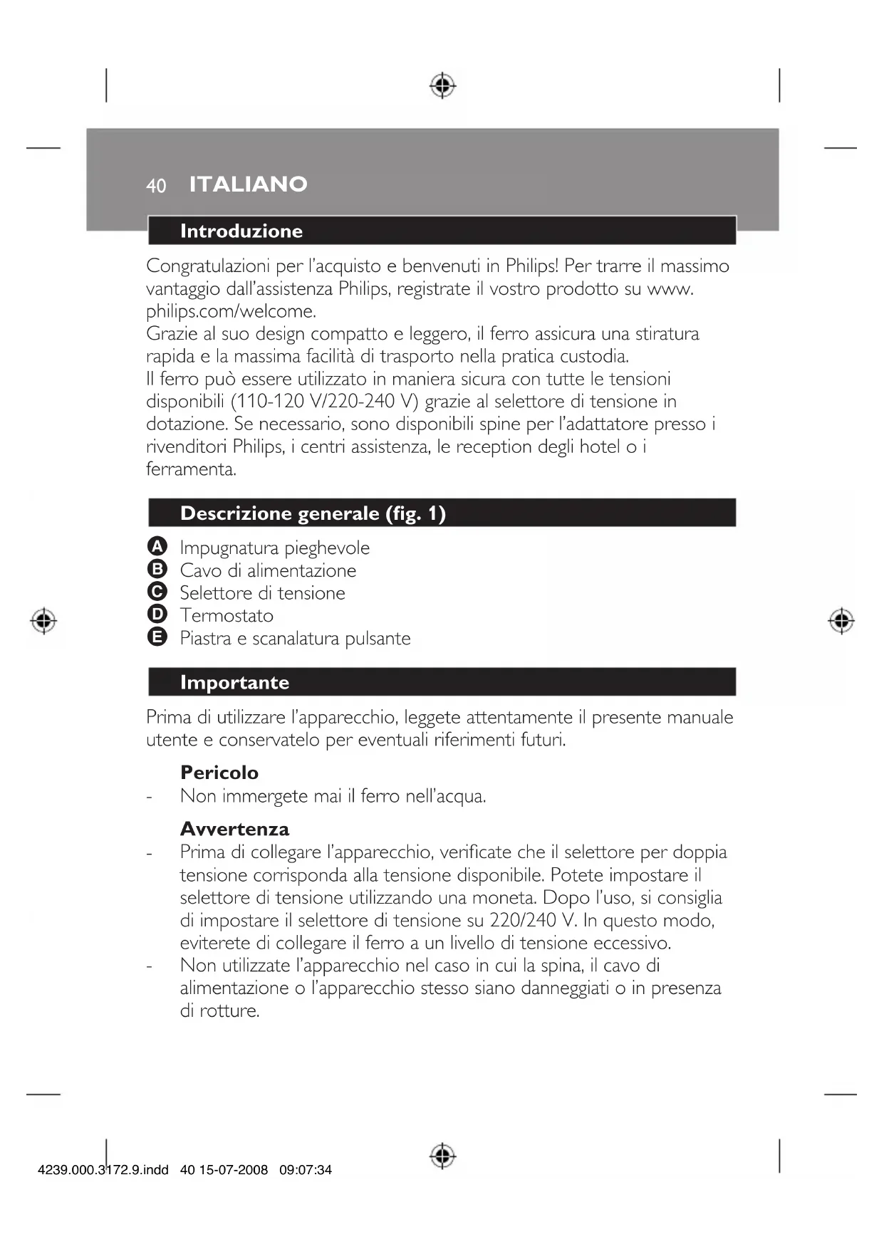 FRANÇAIS38 4239.000.3172.9.indd 38 15-07-2008 09:07:33Dépannage Cette rubrique présente les problèmes les plus courants que vous pouvez rencontrer avec votre appareil. Si vous ne parvenez pas à résoudre le problème à l’aide des informations ci-dessous, contactez le Service Consommateurs Philips de votre pays. Problème Cause possible Solution Le fer à repasser est branché, mais la semelle est froide. Problème de branchement. Vériez le cordon d’alimentation, la che et la prise secteur. Le thermostat est probablement réglé sur MIN. Réglez le thermostat sur la température requise. FRANÇAIS 39 4239.000.3172.9.indd 39 15-07-2008 09:07:3340 Introduzione Congratulazioni per l’acquisto e benvenuti in Philips! Per trarre il massimo vantaggio dall’assistenza Philips, registrate il vostro prodotto su www. philips.com/welcome. Grazie al suo design compatto e leggero, il ferro assicura una stiratura rapida e la massima facilità di trasporto nella pratica custodia. Il ferro può essere utilizzato in maniera sicura con tutte le tensioni disponibili (110-120 V/220-240 V) grazie al selettore di tensione in dotazione. Se necessario, sono disponibili spine per l’adattatore presso i rivenditori Philips, i centri assistenza, le reception degli hotel o i ferramenta. Descrizione generale (g. 1) A Impugnatura pieghevole B Cavo di alimentazione C Selettore di tensione D Termostato E Piastra e scanalatura pulsante Importante Prima di utilizzare l’apparecchio, leggete attentamente il presente manuale utente e conservatelo per eventuali riferimenti futuri. Pericolo Non immergete mai il ferro nell’acqua. Avvertenza Prima di collegare l’apparecchio, vericate che il selettore per doppia tensione corrisponda alla tensione disponibile. Potete impostare il selettore di tensione utilizzando una moneta. Dopo l’uso, si consiglia di impostare il selettore di tensione su 220/240 V. In questo modo, eviterete di collegare il ferro a un livello di tensione eccessivo. Non utilizzate l’apparecchio nel caso in cui la spina, il cavo di alimentazione o l’apparecchio stesso siano danneggiati o in presenza di rotture.
