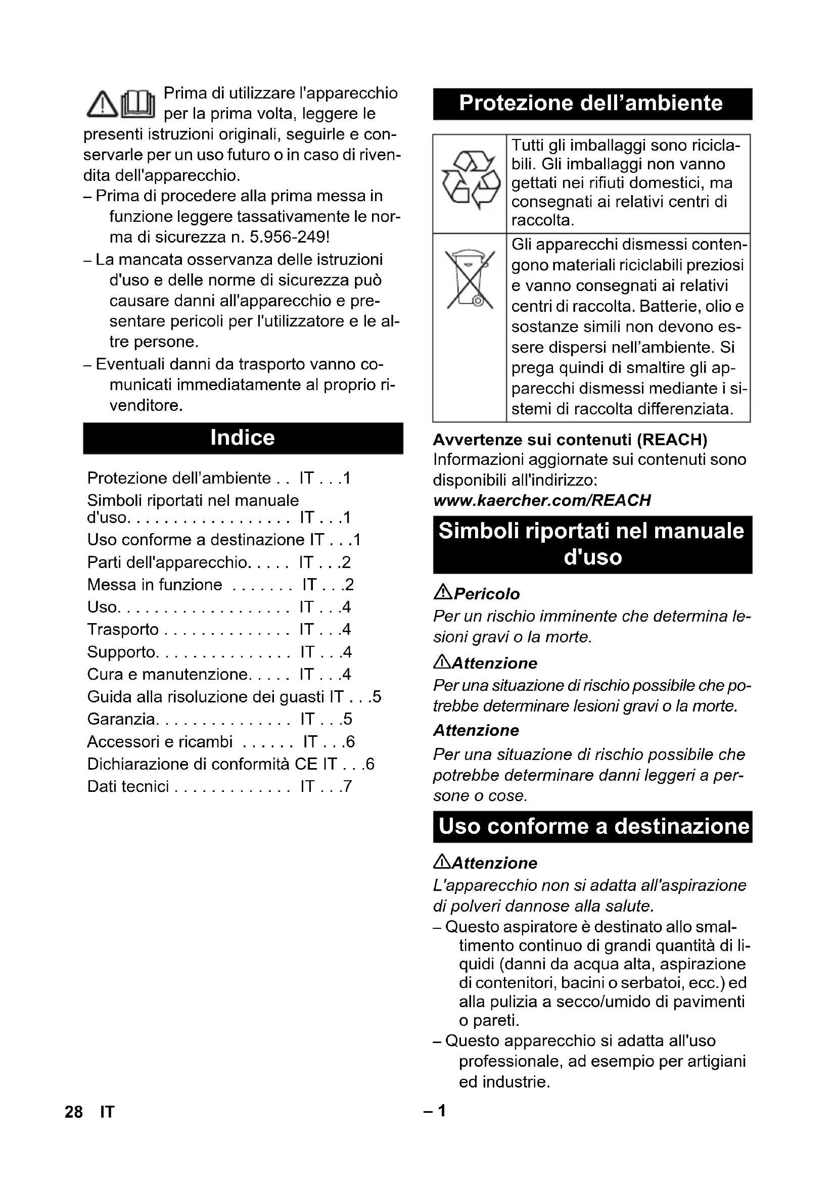 - Référence Longueur de câble EU 6.649-413.0 10 m CH 6.649-254.0 10 m 27FR– 1 Prima di utilizzare l'apparecchio per la prima volta, leggere le presenti istruzioni originali, seguirle e con- servarle per un uso futuro o in caso di riven- dita dell'apparecchio. – Prima di procedere alla prima messa in funzione leggere tassativamente le nor- ma di sicurezza n. 5.956-249! – La mancata osservanza delle istruzioni d'uso e delle norme di sicurezza può causare danni all'apparecchio e pre- sentare pericoli per l'utilizzatore e le al- tre persone. – Eventuali danni da trasporto vanno co- municati immediatamente al proprio ri- venditore. Avvertenze sui contenuti (REACH) Informazioni aggiornate sui contenuti sono disponibili all'indirizzo: www.kaercher.com/REACH Pericolo Per un rischio imminente che determina le- sioni gravi o la morte. 몇 Attenzione Per una situazione di rischio possibile che po- trebbe determinare lesioni gravi o la morte. Attenzione Per una situazione di rischio possibile che potrebbe determinare danni leggeri a per- sone o cose. 몇 Attenzione L'apparecchio non si adatta all'aspirazione di polveri dannose alla salute. – Questo aspiratore è destinato allo smal- timento continuo di grandi quantità di li- quidi (danni da acqua alta, aspirazione di contenitori, bacini o serbatoi, ecc.) ed alla pulizia a secco/umido di pavimenti o pareti. – Questo apparecchio si adatta all'uso professionale, ad esempio per artigiani ed industrie. Indice Protezione dell’ambiente
