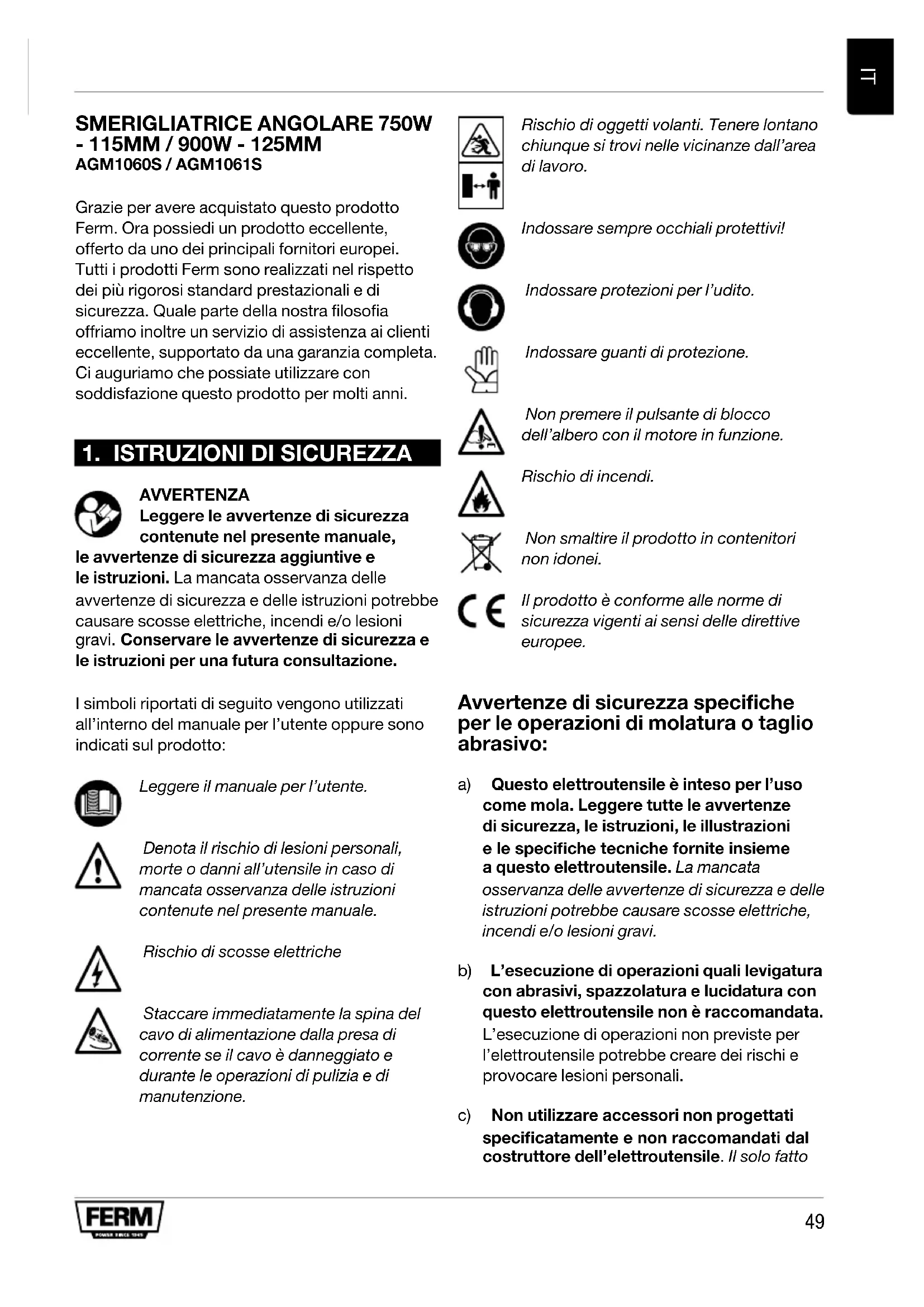 AVVERTENZA Leggere le avvertenze di sicurezza contenute nel presente manuale, le avvertenze di sicurezza aggiuntive e le istruzioni. La mancata osservanza delle avvertenze di sicurezza e delle istruzioni potrebbe causare scosse elettriche, incendi e/o lesioni gravi. Conservare le avvertenze di sicurezza e le istruzioni per una futura consultazione. I simboli riportati di seguito vengono utilizzati all’interno del manuale per l’utente oppure sono indicati sul prodotto: Leggere il manuale per l’utente. Denota il rischio di lesioni personali, morte o danni all’utensile in caso di mancata osservanza delle istruzioni contenute nel presente manuale. Rischio di scosse elettriche Staccare immediatamente la spina del cavo di alimentazione dalla presa di corrente se il cavo è danneggiato e durante le operazioni di pulizia e di manutenzione. Rischio di oggetti volanti. Tenere lontano chiunque si trovi nelle vicinanze dall’area di lavoro. Indossare sempre occhiali protettivi! Indossare protezioni per l’udito. Indossare guanti di protezione. Non premere il pulsante di blocco dell’albero con il motore in funzione. Rischio di incendi. Non smaltire il prodotto in contenitori non idonei. Il prodotto è conforme alle norme di sicurezza vigenti ai sensi delle direttive europee. Avvertenze di sicurezza specifiche per le operazioni di molatura o taglio abrasivo: a) Questo elettroutensile è inteso per l’uso come mola. Leggere tutte le avvertenze di sicurezza, le istruzioni, le illustrazioni e le speciche tecniche fornite insieme a questo elettroutensile. La mancata osservanza delle avvertenze di sicurezza e delle istruzioni potrebbe causare scosse elettriche, incendi e/o lesioni gravi. b) L’esecuzione di operazioni quali levigatura con abrasivi, spazzolatura e lucidatura con questo elettroutensile non è raccomandata. L’esecuzione di operazioni non previste per l’elettroutensile potrebbe creare dei rischi e provocare lesioni personali. c) Non utilizzare accessori non progettati specicatamente e non raccomandati dal costruttore dell’elettroutensile. Il solo fatto50