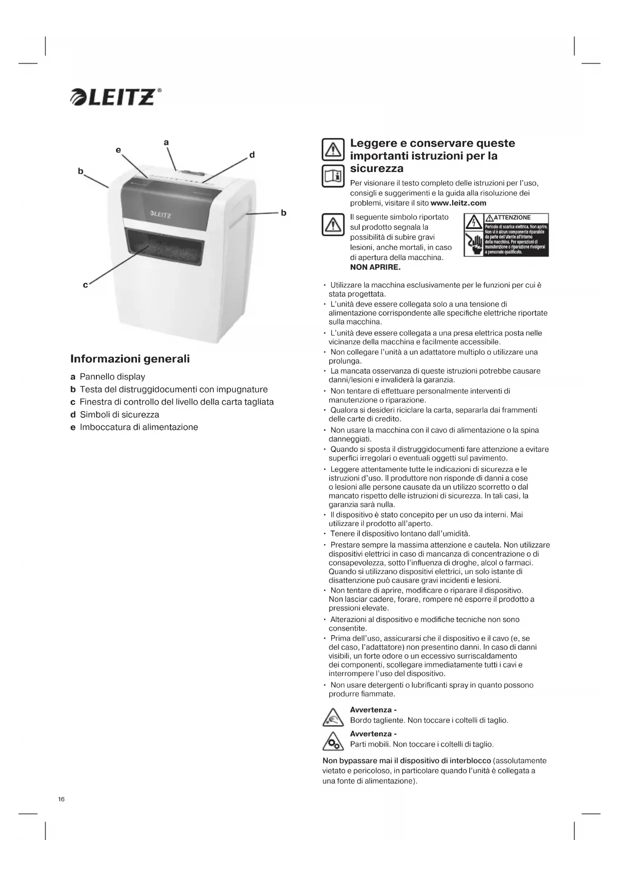 - Non usare detergenti o lubrificanti spray in quanto possono produrre fiammate. Leggere e conservare queste importanti istruzioni per la sicurezza Per visionare il testo completo delle istruzioni per l’uso, consigli e suggerimenti e la guida alla risoluzione dei problemi, visitare il sito www.leitz.com Il seguente simbolo riportato sul prodotto segnala la possibilità di subire gravi lesioni, anche mortali, in caso di apertura della macchina. NON APRIRE. Pericolo di scarica elettrica. Non aprire. Non vi è alcun componente riparabile da parte dell’utente all’interno della macchina. Per operazioni di manutenzione o riparazione rivolgersi a personale qualicato. ATTENZIONE