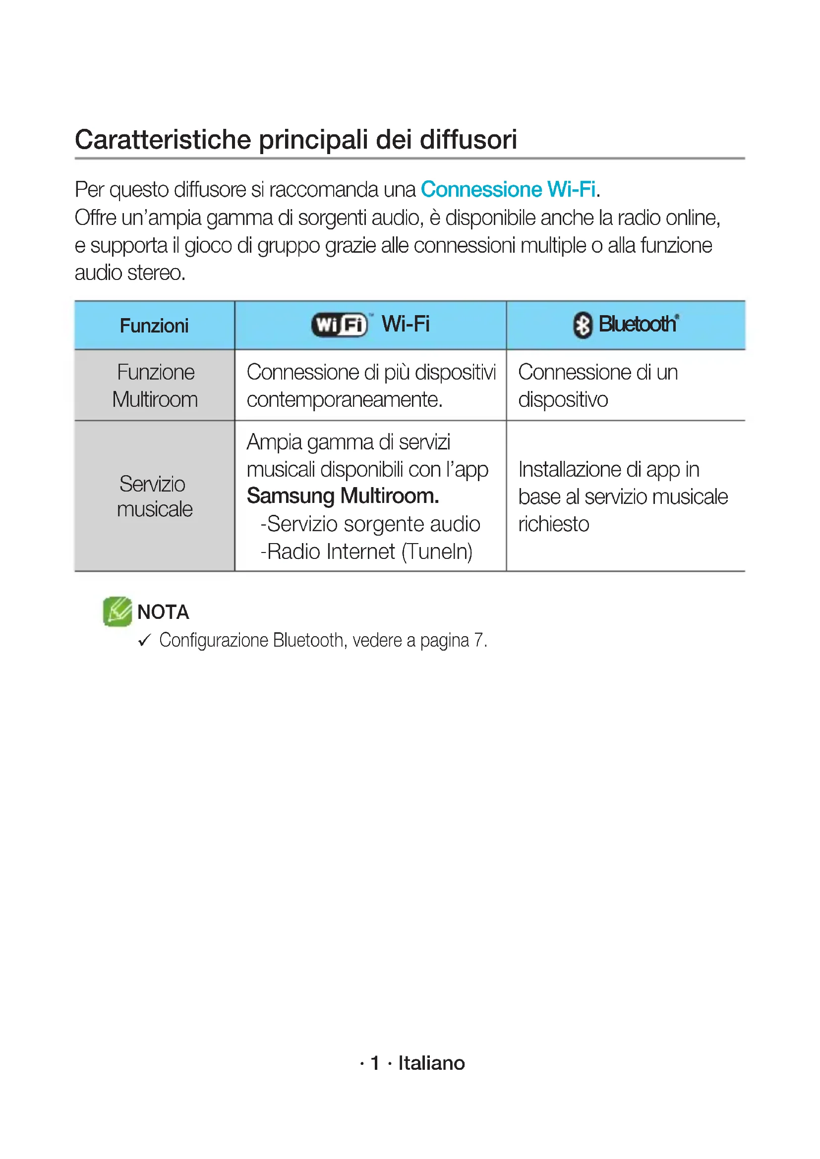 Ha a kapcsolat nem hozható létre, akkor lásd az “Csatlakoztatás előtti Ellenőrzőlista” részt a 9. és 10. oldalon. WAM3501-EN_15p-HUN-QSG_0901.indd 15 2016-09-01 4:54:46· 1 · Italiano Caratteristiche principali dei diffusori Per questo diffusore si raccomanda una Connessione Wi-Fi. Offre un’ampia gamma di sorgenti audio, è disponibile anche la radio online, e supporta il gioco di gruppo grazie alle connessioni multiple o alla funzione audio stereo. Funzioni Wi-Fi Bluetooth Funzione Multiroom Connessione di più dispositivi contemporaneamente. Connessione di un dispositivo Servizio musicale Ampia gamma di servizi musicali disponibili con l’app Samsung Multiroom. - Servizio sorgente audio - Radio Internet (Tuneln) Installazione di app in base al servizio musicale richiesto NOTA