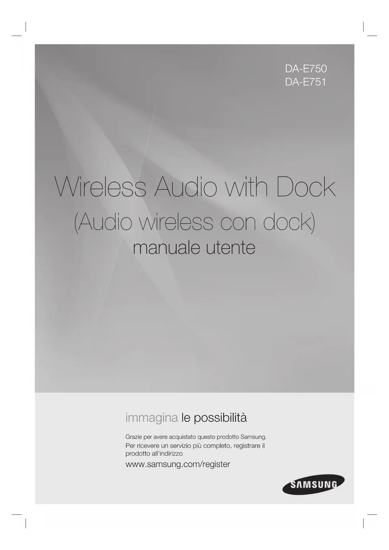 678) www.samsung.com SWEDEN 0771 726 7864 (SAMSUNG) www.samsung.com Switzerland 0848 - SAMSUNG(7267864, CHF 0.08/min) www.samsung.com/ch www.samsung.com/ch_ fr (French) U.K 0330 SAMSUNG (7267864) www.samsung.com EIRE 0818 717100 www.samsung.com LITHUANIA 8-800-77777 www.samsung.com LATVIA 8000-7267 www.samsung.com ESTONIA 800-7267 www.samsung.com Wenden Sie sich an SAMSUNG WORLD WIDE Wenn Sie Fragen oder Anmerkungen zu Produkten von Samsung haben, wenden Sie sich an den Kundendienst von SAMSUNG.Wireless Audio with Dock (Audio wireless con dock) manuale utente immagina le possibilità Grazie per avere acquistato questo prodotto Samsung.Per ricevere un servizio più completo, registrare il prodotto all'indirizzo www.samsung.com/register DA-E750 DA-E7512 caratteristiche AllShare Play Per riprodurre sull'audio wireless con dock, attraverso una connessione di rete, la musica salvata sui dispositivi (come PC, smartphone o NAS). AirPlay Per riprodurre sull'audio wireless con dock la musica salvata sui dispositivi Apple. Sistema di diffusori docking audio doppio Utilizzando la docking station doppia del sistema, collegare, caricare e quindi riprodurre il dispositivo Galaxy o Apple Samsung attraverso i diffusori integrati. Supporto host USB Utilizzando la funzione host USB dell'audio wireless con dock è possibile collegare e riprodurre file musicali da dispositivi di memorizzazione USB esterni come lettori MP3, memorie flash USB ecc. Funzione Bluetooth È possibile collegare un dispositivo Bluetooth all'audio wireless con dock per ascoltare musica dal dispositivo con audio stereo di alta qualità, tutto senza fili! aptX