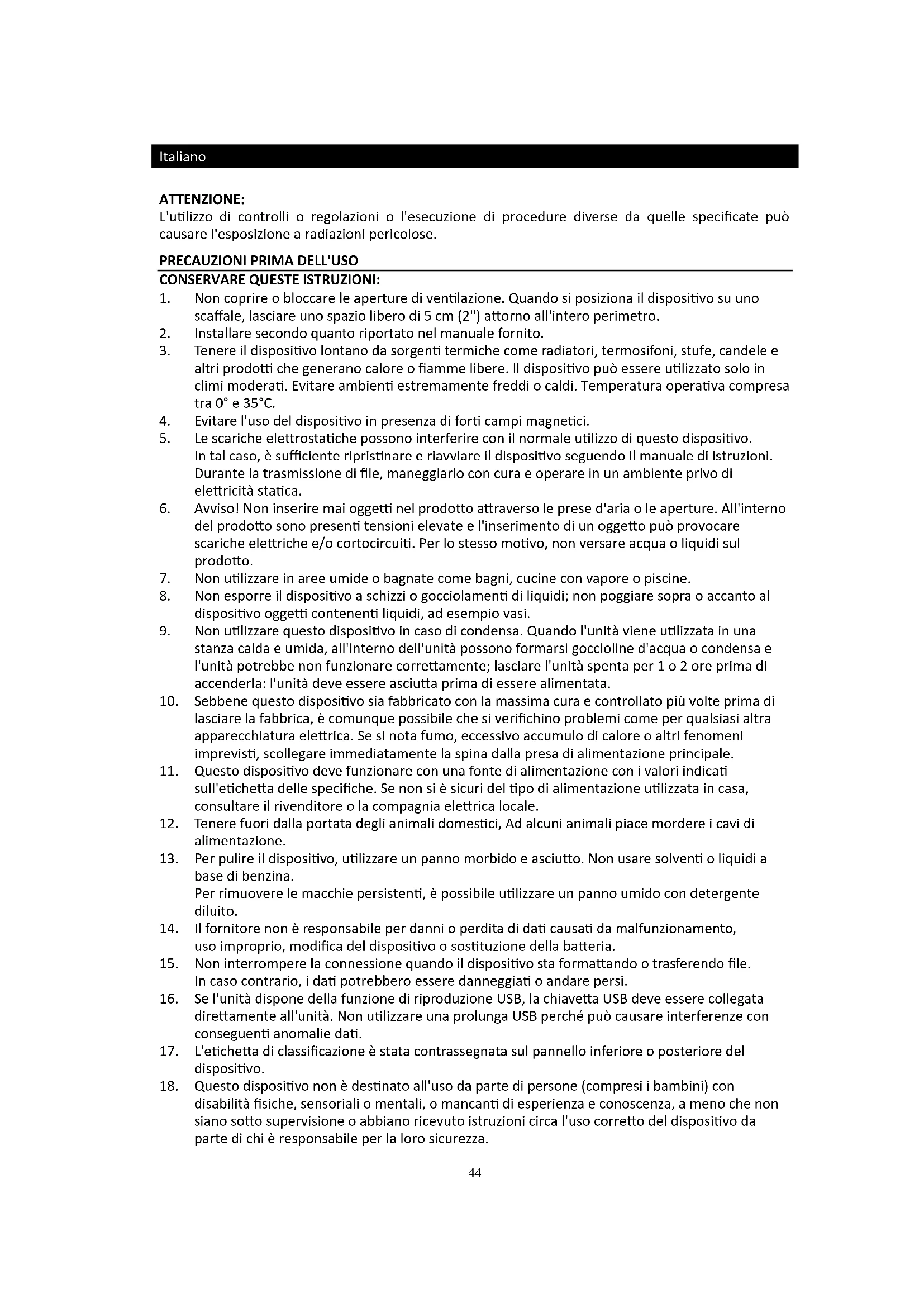 18. Questo dispositivo non è destinato all'uso da parte di persone (compresi i bambini) con