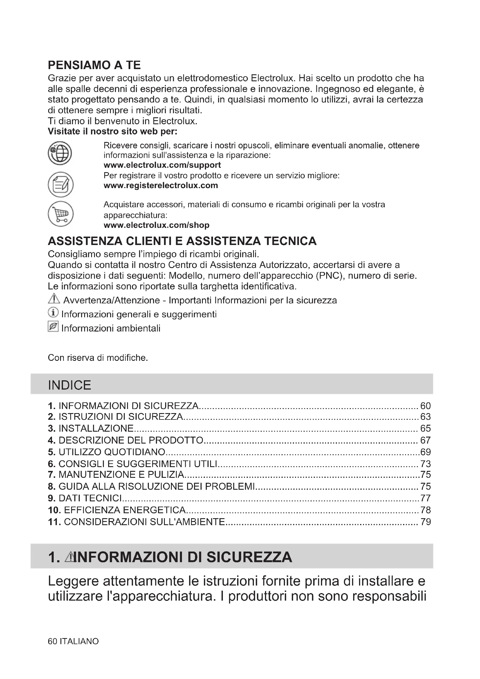 Grazie per aver acquistato un elettrodomestico Electrolux. Hai scelto un prodotto che ha alle spalle decenni di esperienza professionale e innovazione. Ingegnoso ed elegante, è stato progettato pensando a te. Quindi, in qualsiasi momento lo utilizzi, avrai la certezza di ottenere sempre i migliori risultati. Ti diamo il benvenuto in Electrolux. Visitate il nostro sito web per:Ricevere consigli, scaricare i nostri opuscoli, eliminare eventuali anomalie, ottenereinformazioni sull'assistenza e la riparazione:www.electrolux.com/supportPer registrare il vostro prodotto e ricevere un servizio migliore:www.registerelectrolux.comAcquistare accessori, materiali di consumo e ricambi originali per la vostraapparecchiatura:www.electrolux.com/shop