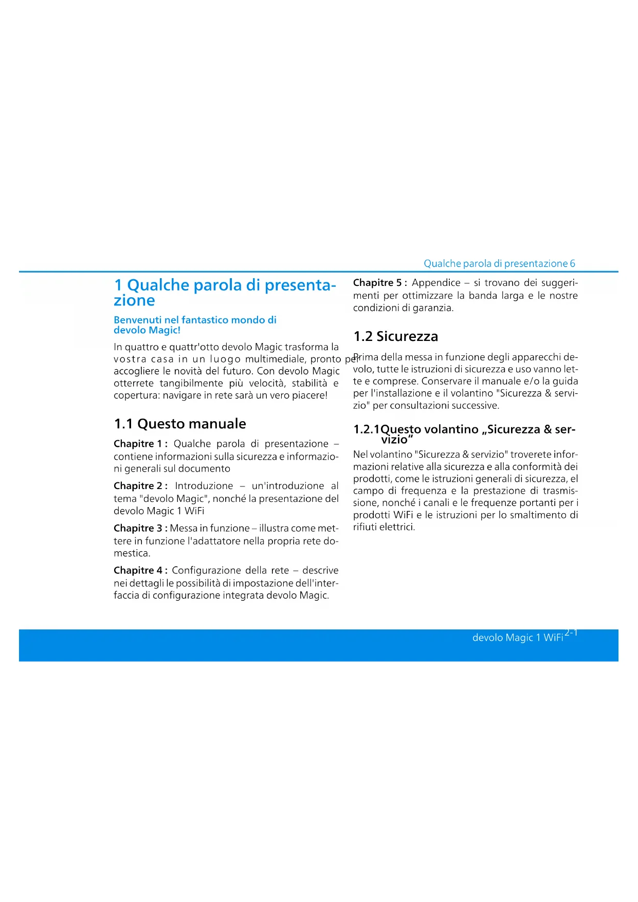 vizio“ Nel volantino "Sicurezza & servizio" troverete infor- mazioni relative alla sicurezza e alla conformità dei prodotti, come le istruzioni generali di sicurezza, el campo di frequenza e la prestazione di trasmis- sione, nonché i canali e le frequenze portanti per i prodotti WiFi e le istruzioni per lo smaltimento di rifiuti elettrici.7 Qualche parola di presentazione devolo Magic 1 WiFi 2-1 Il volantino e la guida per l'installazione sono allegate a tutti i prodotti in forma stampato; questo manuale del prodotto è disponibile in forma digitale. Inoltre, queste e altre descrizioni dei prodot- ti applicabili sono disponibili nell'area di download della pagina del rispettivo pro- dotto sul sito www.devolo.global