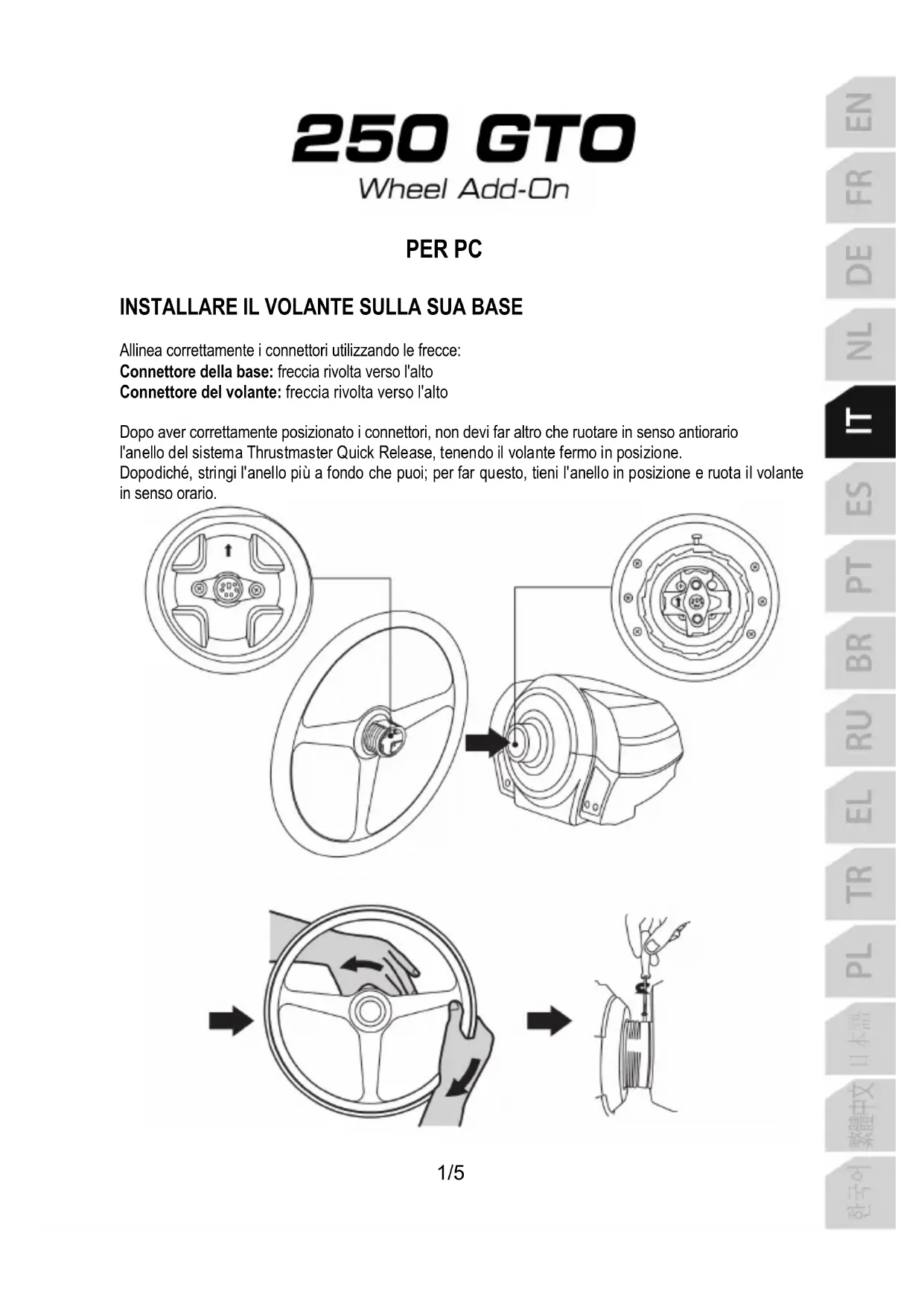 Non utilizzare troppa forza per stringere la piccola vite di fissaggio (con un cacciavite Phillips)! Smetti di avvitarla non appena avverti un po' di resistenza. INFORMAZIONE IMPORTANTE! Affinché il tuo volante 250 GTO Wheel Add-On funzioni correttamente assieme alla tua base per il volante (in particolare, con le basi TS-PC Racer, TS-XW Racer, T-GT, TX, T300 e T500), è imperativo che tu aggiorni il firmware della tua base alla versione più recente disponibile sul sito https://support.thrustmaster.com (clicca su Volanti / [nome della tua base] / Firmware, segui poi le istruzioni e la procedura di download e installazione).3/5 Informazioni sulla garanzia al consumatore A livello mondiale, Guillemot Corporation S.A., avente sede legale in Place du Granier, B.P. 97143, 35571 Chantepie, Francia (d’ora in avanti “Guillemot”) garantisce al consumatore che il presente prodotto Thrustmaster sarà privo di difetti relativi ai materiali e alla fabbricazione, per un periodo di garanzia corrispondente al limite temporale stabilito per la presentazione di un reclamo riguardante la conformità del prodotto in questione. Nei paesi della Comunità Europea, tale periodo equivale a due (2) anni a partire dalla consegna del prodotto Thrustmaster. In altri paesi, la durata della garanzia corrisponde al limite temporale stabilito per la presentazione di un reclamo riguardante la conformità del prodotto Thrustmaster in base alle leggi applicabili nel paese in cui il consumatore risiedeva alla data di acquisto del prodotto Thrustmaster (qualora nel paese in questione non esistesse alcuna norma a riguardo, il periodo di garanzia corrisponderà a un (1) anno a partire dalla data originale di acquisto del prodotto Thrustmaster). Qualora, durante il periodo di garanzia, il prodotto dovesse apparire difettoso, contatti immediatamente l’Assistenza Tecnica, che le indicherà la procedura da seguire. Qualora il difetto dovesse essere confermato, il prodotto dovrà essere riportato al luogo di acquisto (o qualsiasi altro luogo indicato dall’Assistenza Tecnica). Nel contesto della presente garanzia, il prodotto difettoso di proprietà del consumatore potrà essere sostituito o reso nuovamente funzionante, a discrezione dell’Assistenza Tecnica. Se, durante il periodo coperto dalla garanzia, il prodotto Thrustmaster fosse oggetto di tale rimessa in operatività, alla rimanente durata della garanzia dovrà essere aggiunto un periodo di almeno sette (7) giorni, durante il quale il prodotto risulta non utilizzabile (tale periodo intercorre dalla data della richiesta di intervento da parte del consumatore o dalla data in cui il prodotto in questione è reso disponibile per la rimessa in operatività, questo nel caso in cui tale data sia successiva alla data di richiesta di intervento). Qualora le leggi applicabili in materia lo consentano, la totale responsabilità di Guillemot e delle sue controllate (compresi i danni conseguenti) si limita alla rimessa in operatività o alla sostituzione del prodotto Thrustmaster. Qualora le leggi applicabili in materia lo consentano, Guillemot declina ogni garanzia sulla commerciabilità o la conformità a finalità particolari. La presente garanzia non potrà essere applicata: (1) se il prodotto è stato modificato, aperto, alterato o ha subito danni derivanti da un uso inappropriato o non autorizzato, da negligenza, da un incidente, dalla semplice usura, o da qualsiasi altra causa non riconducibile a difetti nei materiali o nell'assemblaggio (compresi, ma non i soli, prodotti Thrustmaster combinati con elementi inadatti, tra cui, in particolare, batterie ricaricabili, caricatori o qualsiasi altro elemento non fornito da Guillemot per questo prodotto); (2) nel caso in cui il prodotto sia stato utilizzato per qualsiasi altro scopo al di fuori dell’uso domestico, comprese finalità professionali o commerciali (esempio: sale giochi, allenamenti, concorsi); (3) in caso di mancato rispetto delle istruzioni fornite dall'Assistenza Tecnica; (4) in caso di software, ovvero software soggetto a una specifica garanzia; (5) ai materiali di consumo (elementi che richiedono la loro sostituzione al termine della loro durata di esercizio come, ad esempio, batterie di tipo convenzionale o cuscinetti protettivi per auricolari o cuffie); (6) agli accessori (ad esempio, cavi, custodie, borsette, borse, cinturini); (7) se il prodotto è stato venduto ad un'asta pubblica. La presente garanzia non è trasferibile. I diritti legali del consumatore, stabiliti dalle leggi vigenti in materia di vendita di beni di consumo nel relativo paese, non vengono intaccati dalla presente garanzia.4/5 Disposizioni addizionali sulla garanzia Per tutta la durata della garanzia, in linea di principio, Guillemot non fornirà alcuna parte di ricambio, in quanto la sola Assistenza Tecnica è la parte autorizzata ad aprire e/o rimettere in funzionamento tutti i prodotti Thrustmaster (fatta eccezione per eventuali procedure di rimessa in operatività che l’Assistenza Tecnica potrebbe richiedere al consumatore, attraverso istruzioni scritte – viste, ad esempio, la semplicità e la mancanza di riservatezza della procedura di rimessa in operatività – e fornendo al consumatore le necessarie parti di ricambio, se ve ne fosse l’esigenza). Considerando i propri cicli di innovazione e per proteggere il proprio know-how e i propri segreti commerciali, in linea di principio, Guillemot non fornirà alcuna notifica o parte di ricambio finalizzata alla rimessa in attività di un qualunque prodotto Thrustmaster il cui periodo di garanzia risultasse scaduto. Responsabilità Qualora le leggi applicabili in materia lo consentano, Guillemot Corporation S.A. (d'ora in avanti “Guillemot”) e le sue controllate declinano ogni responsabilità per qualsiasi danno derivante da almeno una delle seguenti condizioni: (1) il prodotto è stato modificato, aperto o alterato; (2) mancato rispetto delle istruzioni di installazione; (3) 