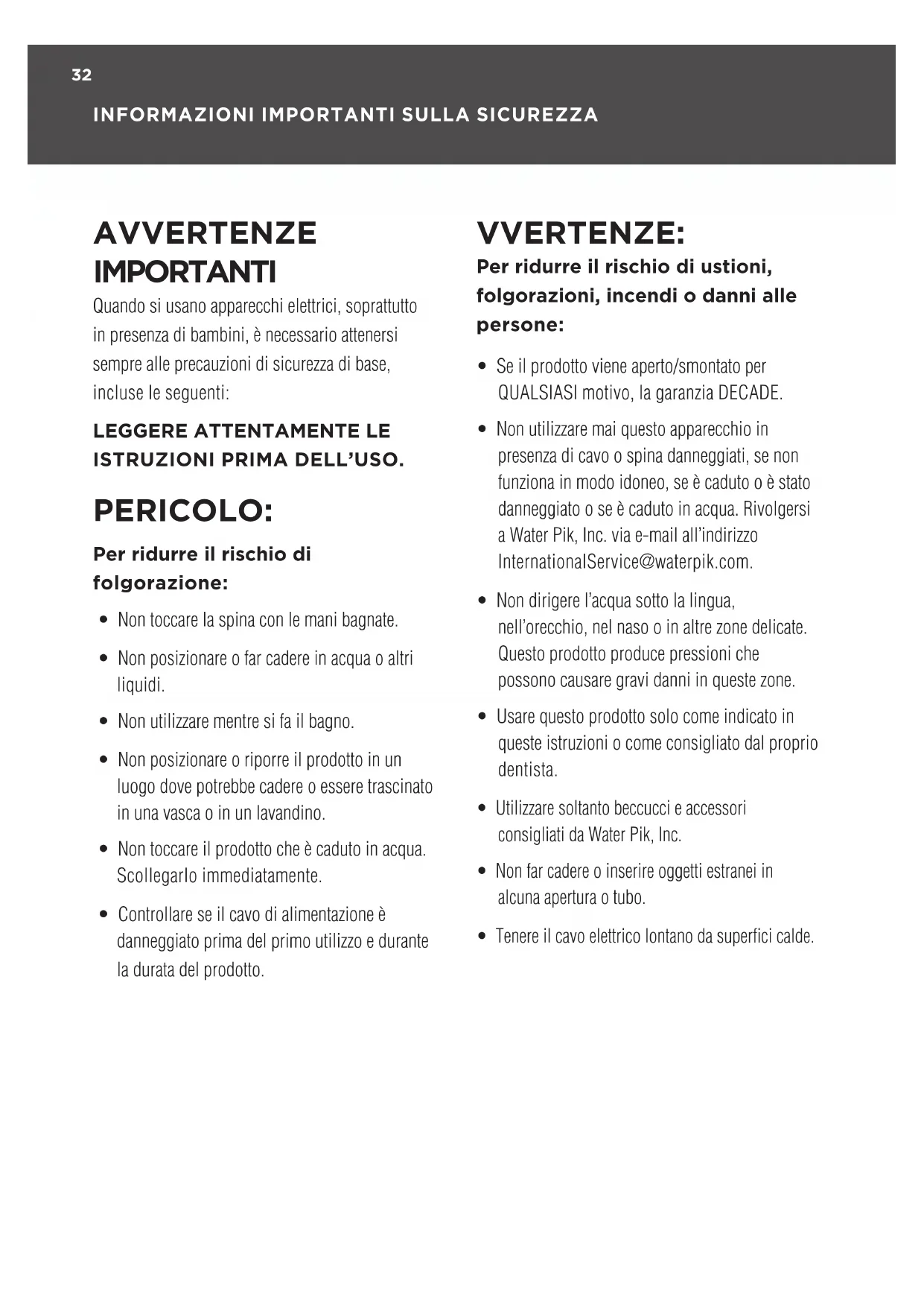 - Non utilizzare mai questo apparecchio in presenza di cavo o spina danneggiati, se non funziona in modo idoneo, se è caduto o è stato danneggiato o se è caduto in acqua. Rivolgersi a Water Pik, Inc. via e-mail all'indirizzo InternationalService@waterpik.com.