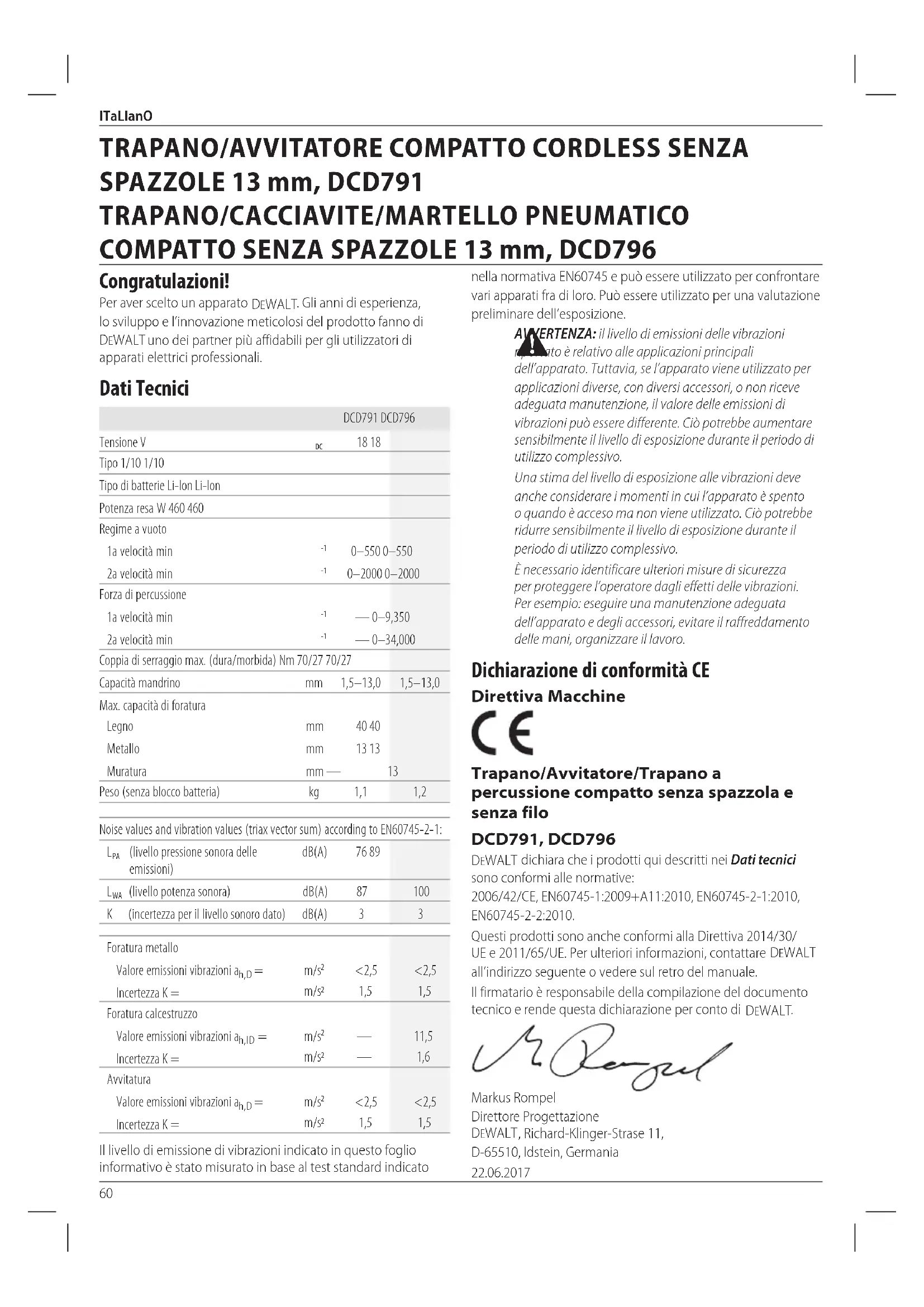 Il firmatario è responsabile della compilazione del documento tecnico e rende questa dichiarazione per conto di DEWALT.