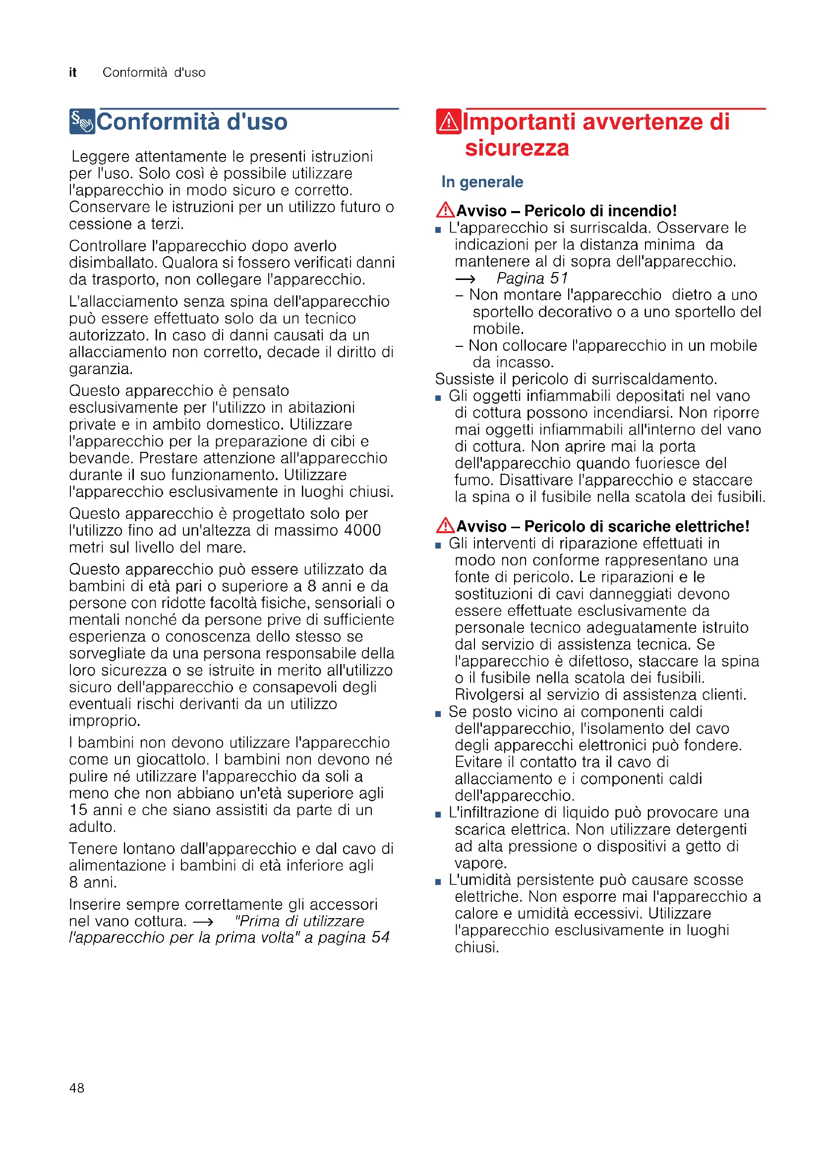 8Conformità d'uso Co n f o r mità d' uso Leggere attentamente le presenti istruzioni per l'uso. Solo così è possibile utilizzare l'apparecchio in modo sicuro e corretto. Conservare le istruzioni per un utilizzo futuro o cessione a terzi. Controllare l'apparecchio dopo averlo disimballato. Qualora si fossero verificati danni da trasporto, non collegare l'apparecchio. L'allacciamento senza spina dell'apparecchio può essere effettuato solo da un tecnico autorizzato. In caso di danni causati da un allacciamento non corretto, decade il diritto di garanzia. Questo apparecchio è pensato esclusivamente per l'utilizzo in abitazioni private e in ambito domestico. Utilizzare l'apparecchio per la preparazione di cibi e bevande. Prestare attenzione all'apparecchio durante il suo funzionamento. Utilizzare l'apparecchio esclusivamente in luoghi chiusi. Questo apparecchio è progettato solo per l'utilizzo fino ad un'altezza di massimo 4000 metri sul livello del mare. Questo apparecchio può essere utilizzato da bambini di età pari o superiore a 8 anni e da persone con ridotte facoltà fisiche, sensoriali o mentali nonché da persone prive di sufficiente esperienza o conoscenza dello stesso se sorvegliate da una persona responsabile della loro sicurezza o se istruite in merito all'utilizzo sicuro dell'apparecchio e consapevoli degli eventuali rischi derivanti da un utilizzo improprio. I bambini non devono utilizzare l'apparecchio come un giocattolo. I bambini non devono né pulire né utilizzare l'apparecchio da soli a meno che non abbiano un'età superiore agli 15 anni e che siano assistiti da parte di un adulto. Tenere lontano dall'apparecchio e dal cavo di alimentazione i bambini di età inferiore agli 8 anni. Inserire sempre correttamente gli accessori nel vano cottura. ~ "Prima di utilizzare l'apparecchio per la prima volta" a pagina 54 (Importanti avvertenze di sicurezza Impor t ant i avv er t enze di si cur ezza In generale :Avviso – Pericolo di incendio! ■ L'apparecchio si surriscalda. Osservare le indicazioni per la distanza minima da mantenere al di sopra dell'apparecchio. ~ Pagina 51 – Non montare l'apparecchio dietro a uno sportello decorativo o a uno sportello del mobile. – Non collocare l'apparecchio in un mobile da incasso. Sussiste il pericolo di surriscaldamento. Pericolo di incendio! ■ Gli oggetti infiammabili depositati nel vano di cottura possono incendiarsi. Non riporre mai oggetti infiammabili all'interno del vano di cottura. Non aprire mai la porta dell'apparecchio quando fuoriesce del fumo. Disattivare l'apparecchio e staccare la spina o il fusibile nella scatola dei fusibili. :Avviso – Pericolo di scariche elettriche! ■ Gli interventi di riparazione effettuati in modo non conforme rappresentano una fonte di pericolo. Le riparazioni e le sostituzioni di cavi danneggiati devono essere effettuate esclusivamente da personale tecnico adeguatamente istruito dal servizio di assistenza tecnica. Se l'apparecchio è difettoso, staccare la spina o il fusibile nella scatola dei fusibili. Rivolgersi al servizio di assistenza clienti. Pericolo di scariche elettriche! ■ Se posto vicino ai componenti caldi dell'apparecchio, l'isolamento del cavo degli apparecchi elettronici può fondere. Evitare il contatto tra il cavo di allacciamento e i componenti caldi dell'apparecchio. Pericolo di scariche elettriche! ■ L'infiltrazione di liquido può provocare una scarica elettrica. Non utilizzare detergenti ad alta pressione o dispositivi a getto di vapore. Pericolo di scariche elettriche! ■ L'umidità persistente può causare scosse elettriche. Non esporre mai l'apparecchio a calore e umidità eccessivi. Utilizzare l'apparecchio esclusivamente in luoghi chiusi. Pericolo di scariche elettriche!Importanti avvertenze di sicurezza it