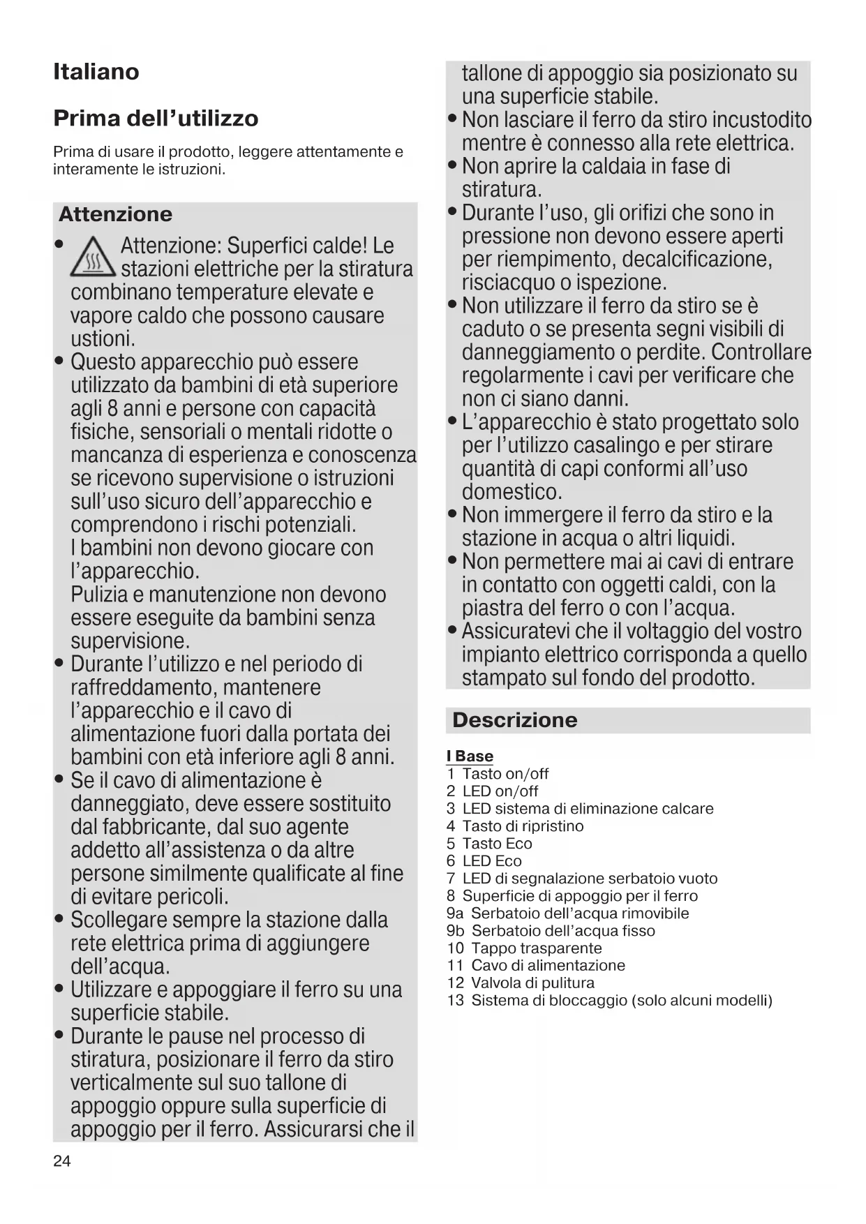 - Attenzione: Superfici calde! Le stazioni elettriche per la stiratura combinano temperature elevate e vapore caldo che possono causare ustioni.