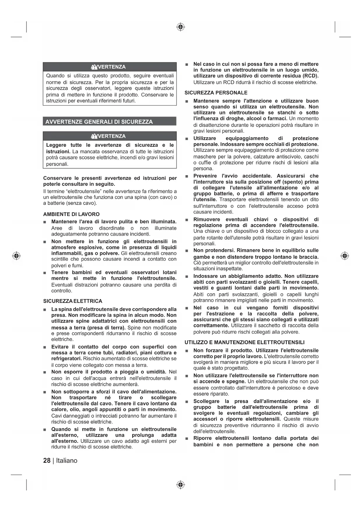 AVVERTENZA Leggere tutte le avvertenze di sicurezza e le istruzioni. La mancata osservanza di tutte le istruzioni potrà causare scosse elettriche, incendi e/o gravi lesioni personali. Conservare le presenti avvertenze ed istruzioni per poterle consultare in seguito. Il termine “elettroutensile” nelle avvertenze fa riferimento a un elettroutensile che funziona con una spina (con cavo) o a batterie (senza cavo).