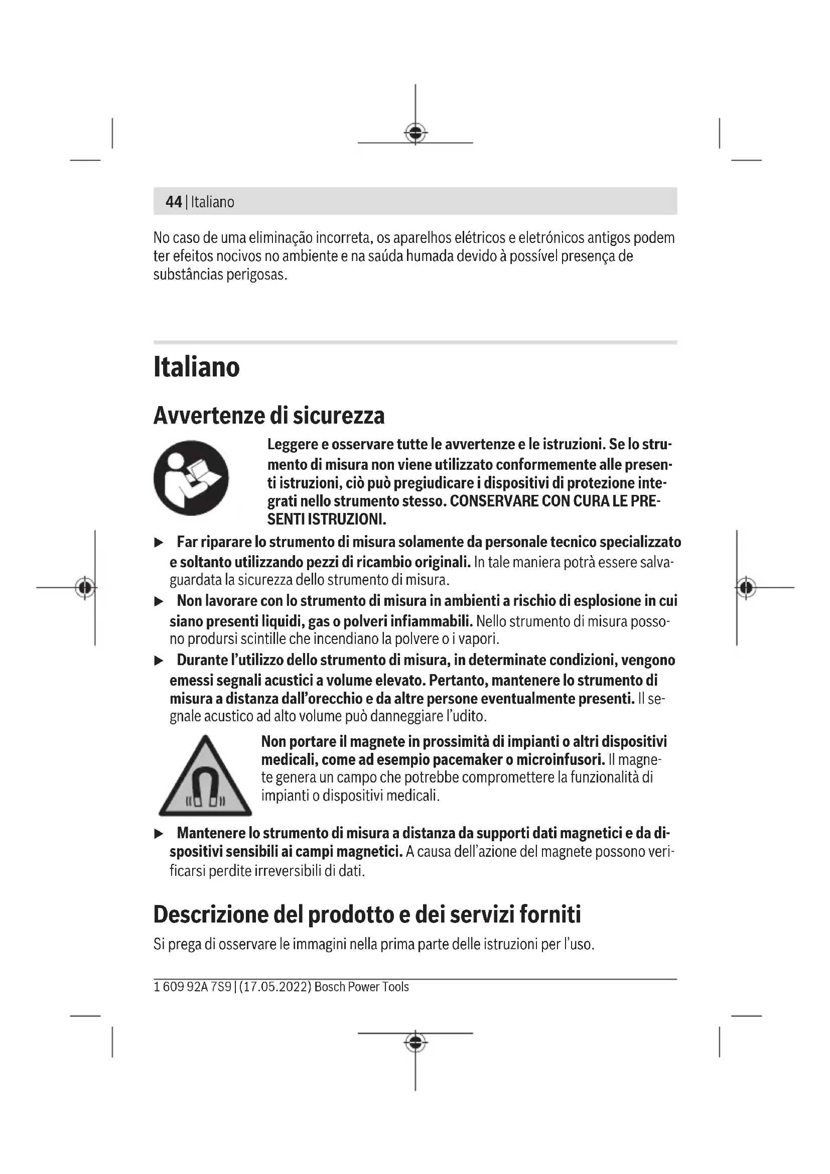 L’accessorio illustrato oppure descritto non è compreso nel volume di fornitura standard. L’accessorio completo è contenuto nel nostro programma accessori. Bosch Power Tools 1 609 92A 7S9 | (17.05.2022)46 | Italiano Dati tecnici Ricevitore laser LR 6 Codice prodotto 3 601 K69 H.. Raggio d’azione