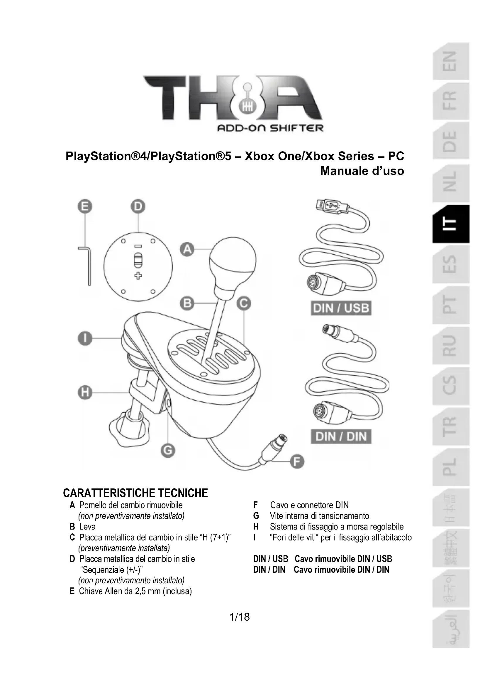 CARATTERISTICHE TECNICHE A Pomello del cambio rimuovibile (non preventivamente installato) B Leva C Placca metallica del cambio in stile “H (7+1)” (preventivamente installata) D Placca metallica del cambio in stile “Sequenziale (+/-)” (non preventivamente installato) E Chiave Allen da 2,5 mm (inclusa) F Cavo e connettore DIN G Vite interna di tensionamento H Sistema di fissaggio a morsa regolabile I “Fori delle viti” per il fissaggio all’abitacolo DIN / USB Cavo rimuovibile DIN / USB DIN / DIN Cavo rimuovibile DIN / DIN2/18 ATTENZIONE Prima di utilizzare questo prodotto, assicurati di aver letto con attenzione il presente manuale. Conserva questo manuale per una futura consultazione. Attenzione – Shock elettrico