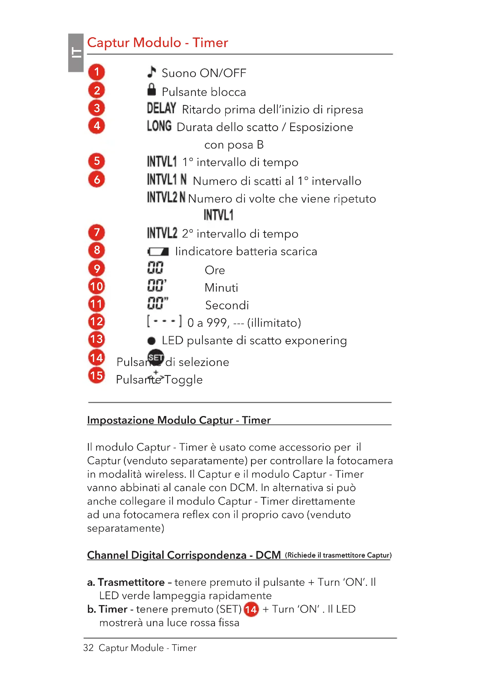 Il modulo Captur - Timer è usato come accessorio per il Captur (venduto separatamente) per controllare la fotocamera in modalità wireless. Il Captur e il modulo Captur - Timer vanno abbinati al canale con DCM. In alternativa si può anche collegare il modulo Captur - Timer direttamente ad una fotocamera reflex con il proprio cavo (venduto separatamente)