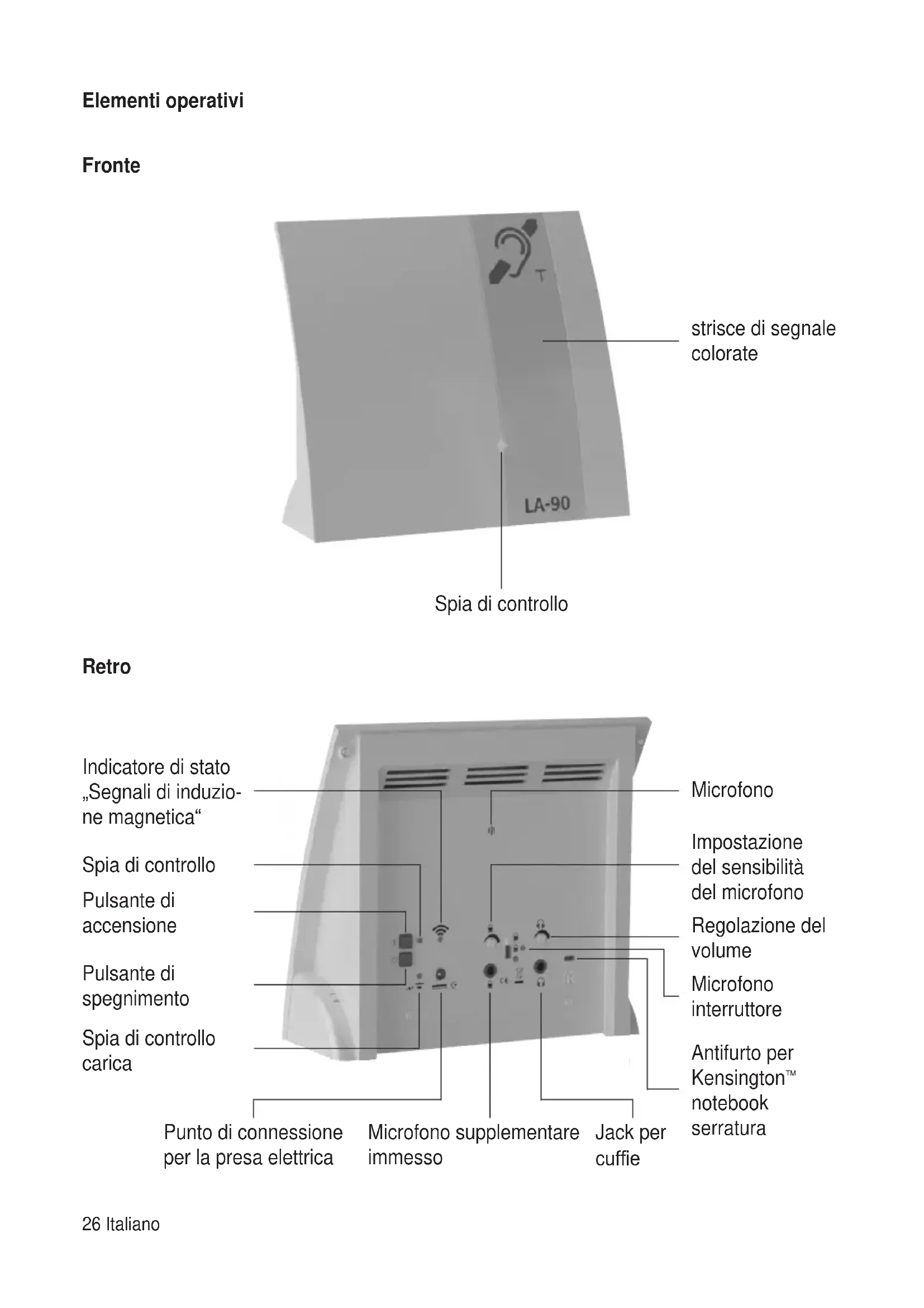 II LA-90 « utilizza il microfono integrato o un microfono esterno per registrar i suoni e riproduurli tramite l'amplificatore sonoro incorporado. I segnali emessi in quello modo possono essere ricevuti da un appearecchio acustico impostato su "T" o "MT".