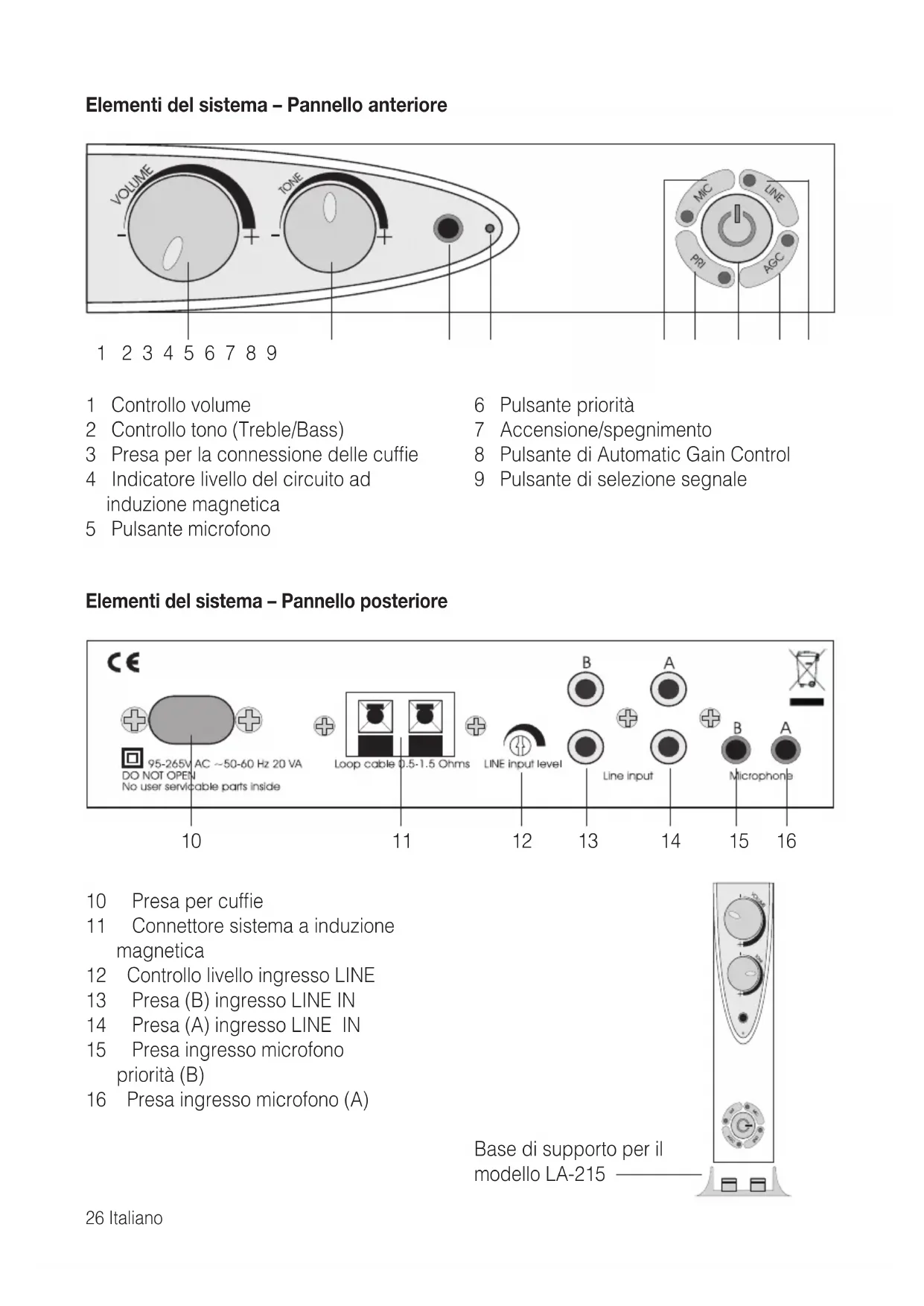 CE 95-265V AC ~50-60 Hz 20 VA DO NOT OPEN No user servicable parts inside 10 11 12 13 14 15 16 Loop cable 0.5-1.5 Ohms LINE Input level B A Line input B A Microphone10 Presa per cuffie
