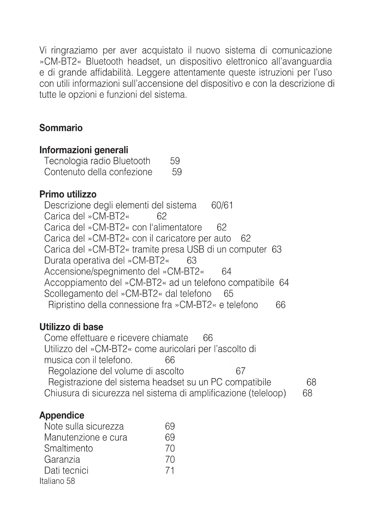 Vi ringraziamo per aver acquistato il nuovo sistema di communicatesione «CM-BT2« Bluetooth headset, un dispositivo elettronico all'avanguardia e di grande affidabilità. Leggere attendamente queste istruzioni per l'uso con utili informazioni sull'accensione del dispositivo e con la descrizione di tutte le opzioni e funzioni del sistema.