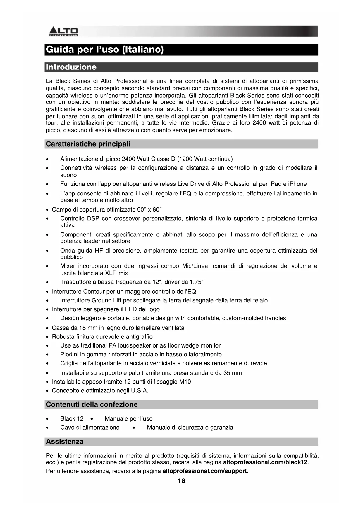 - Cavo di alimentazione • Manuale di sicurezza e garanzia Assistenza Per le ultime informazioni in merito al prodotto (requisiti di sistema, informazioni sulla compatibilità, ecc.) e per la registrazione del prodotto stesso, recarsi alla pagina altoprofessional.com/black12. Per ulteriore assistenza, recarsi alla pagina altoprofessional.com/support.19