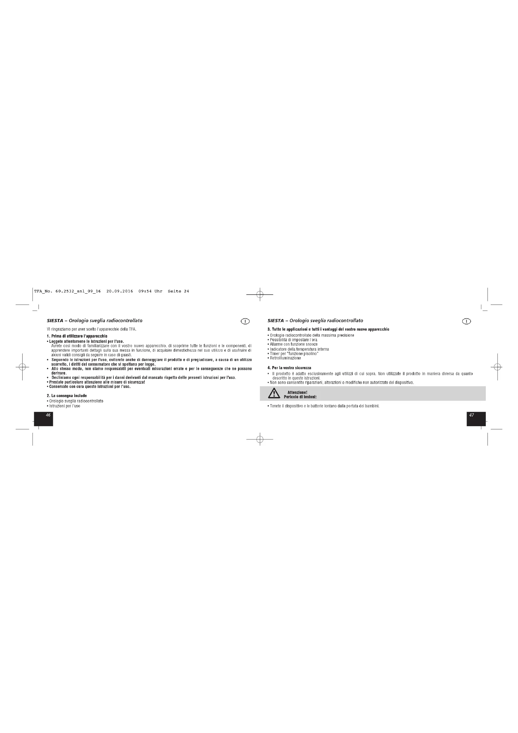 Scarica le istruzioni per il tuo Campanello d'allarme in formato PDF gratuitamente! Trova il tuo manuale 60.2532 - TFA e riprendi in mano il tuo dispositivo elettronico. In questa pagina sono pubblicati tutti i documenti necessari per l'utilizzo del tuo dispositivo. 60.2532 del marchio TFA.